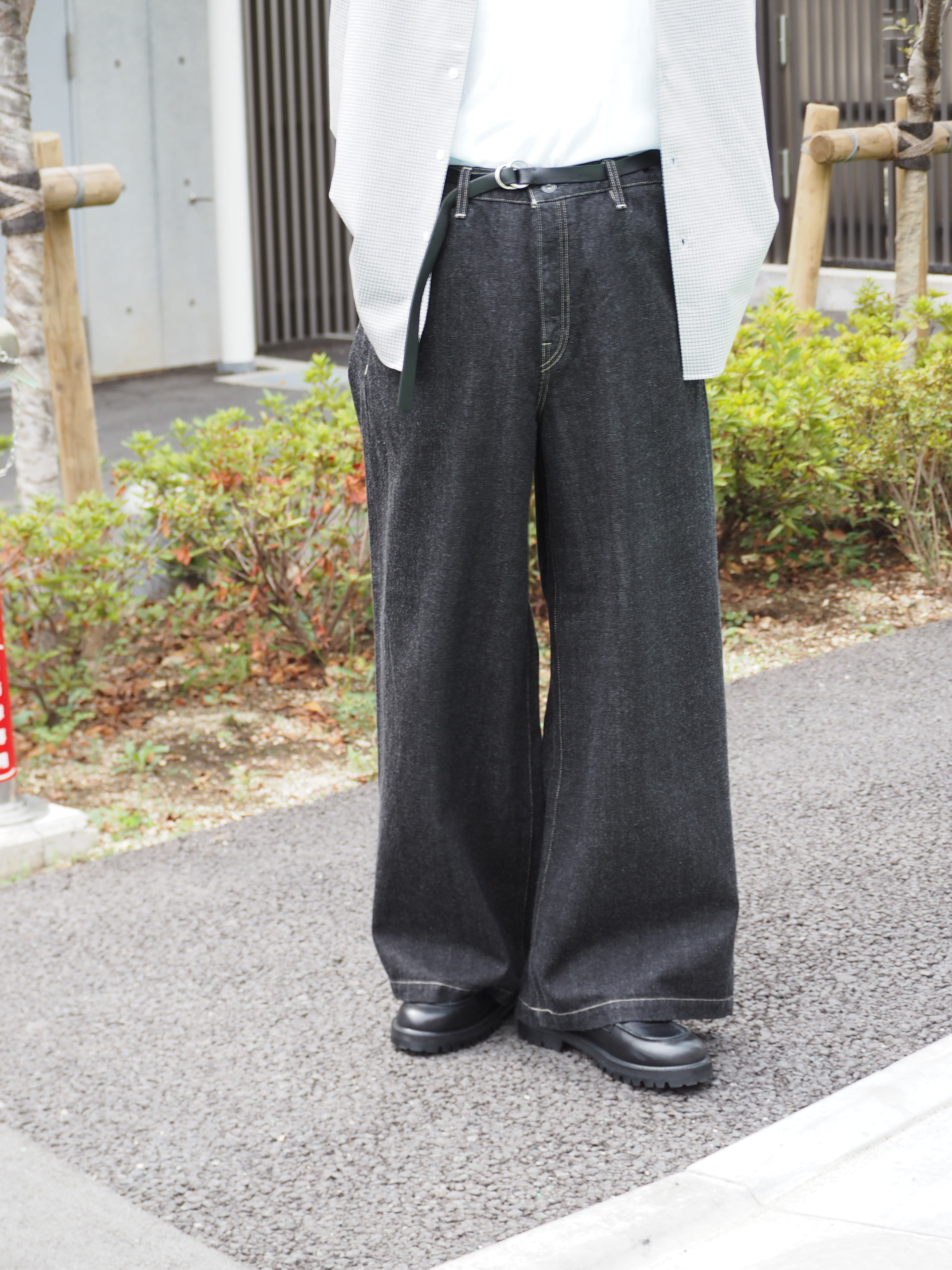 腰回りはすっきりとしたややAラインに見えるバギーシルエットで、脇ポケットは手が入りやすいバイアスポケットを採用。リベットはあえて外し、閂にて補強しすっきりとした表情に。ヴィンテージのジーンズに見られるステッチワークを取り入れ、バックポケットは当て布で補強し、長くご愛用いただけるようデザインしました。