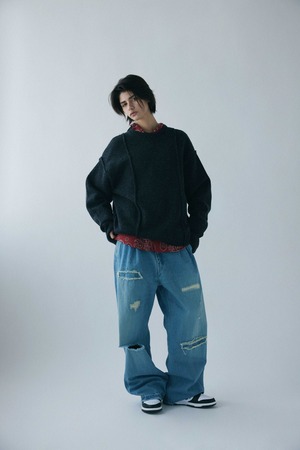 身頃の切り替えや、襟、袖や脇の縫い目を外側に出し、表か裏かわからない「メビウスの輪」をイメージして制作いたしました。