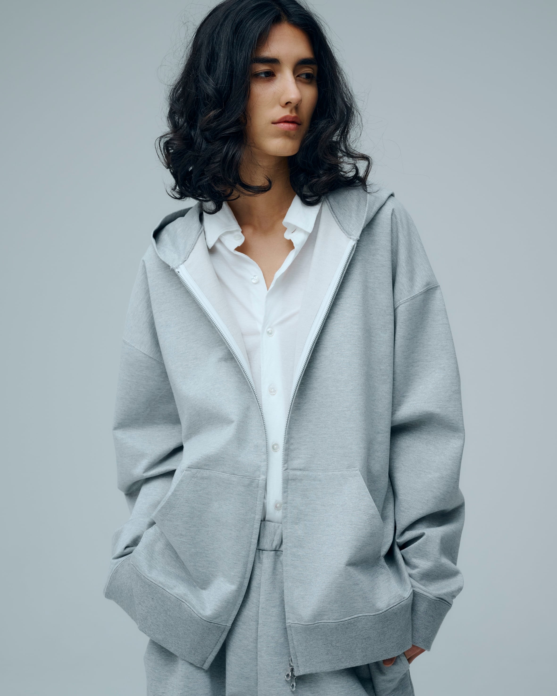 程よいルーズ感のフーディー。アームホール、身幅から、フードまで全てのパーツを計算し、パターンを引くことで、生地のポテンシャルを最大限に生かしております。