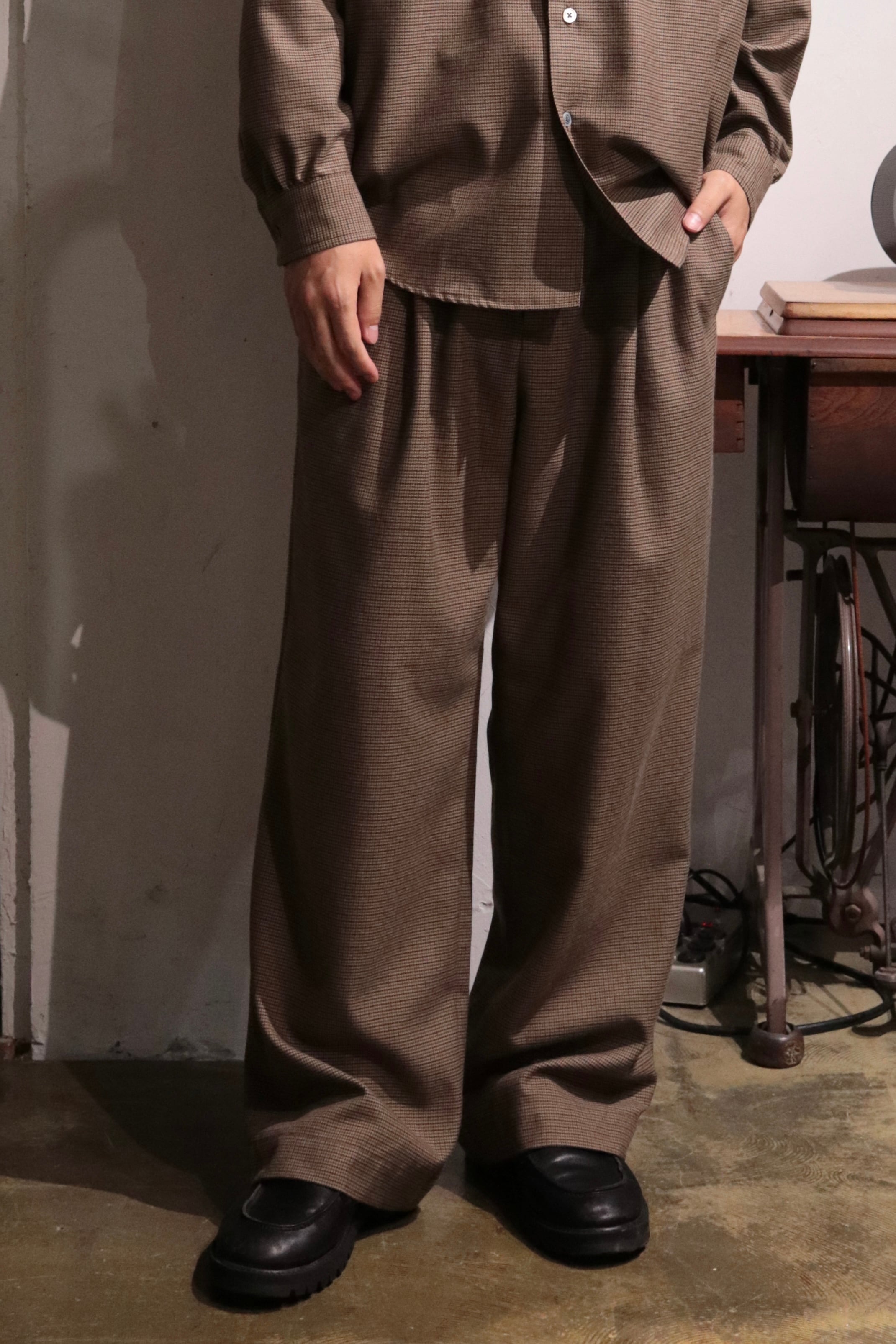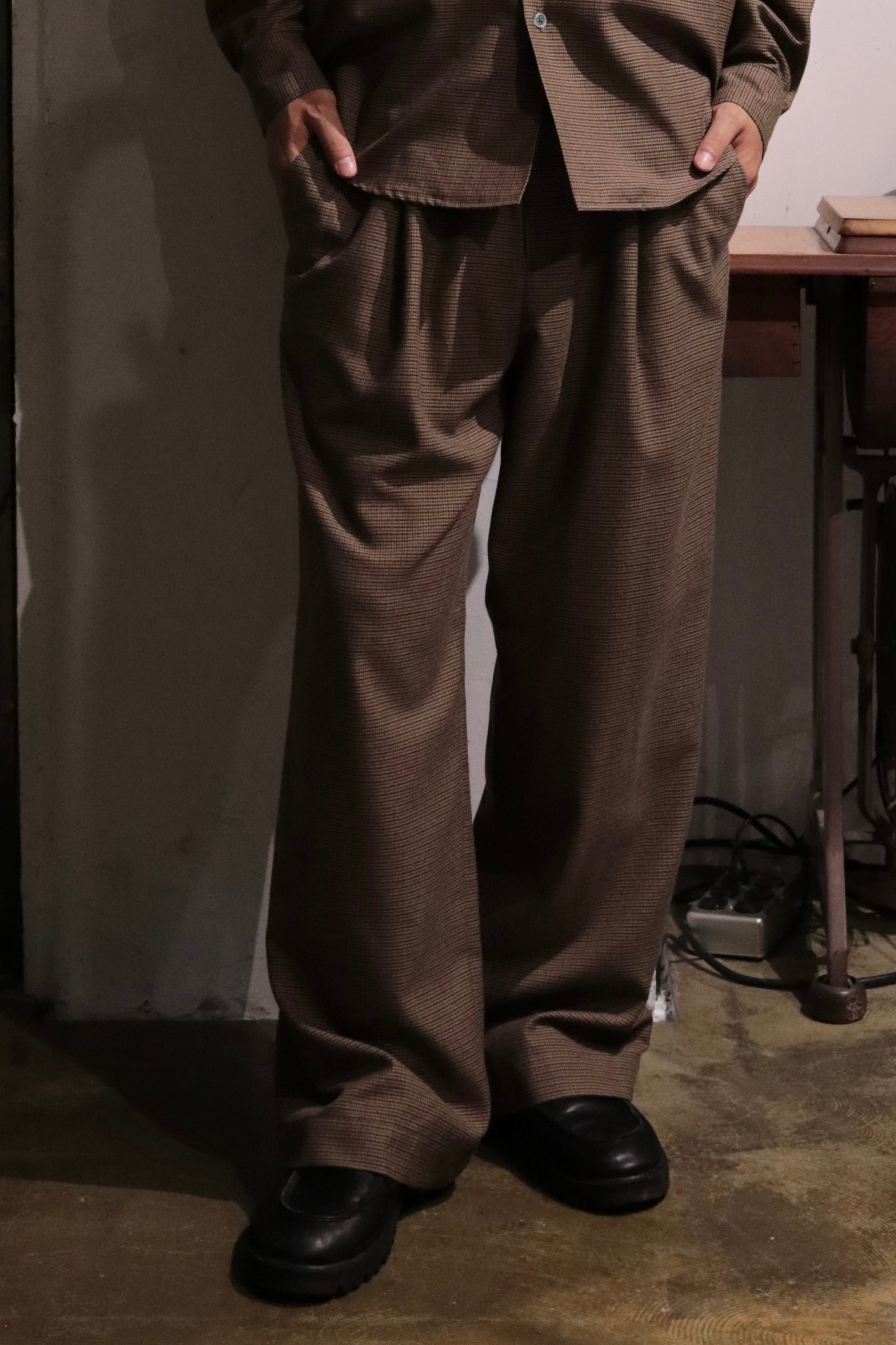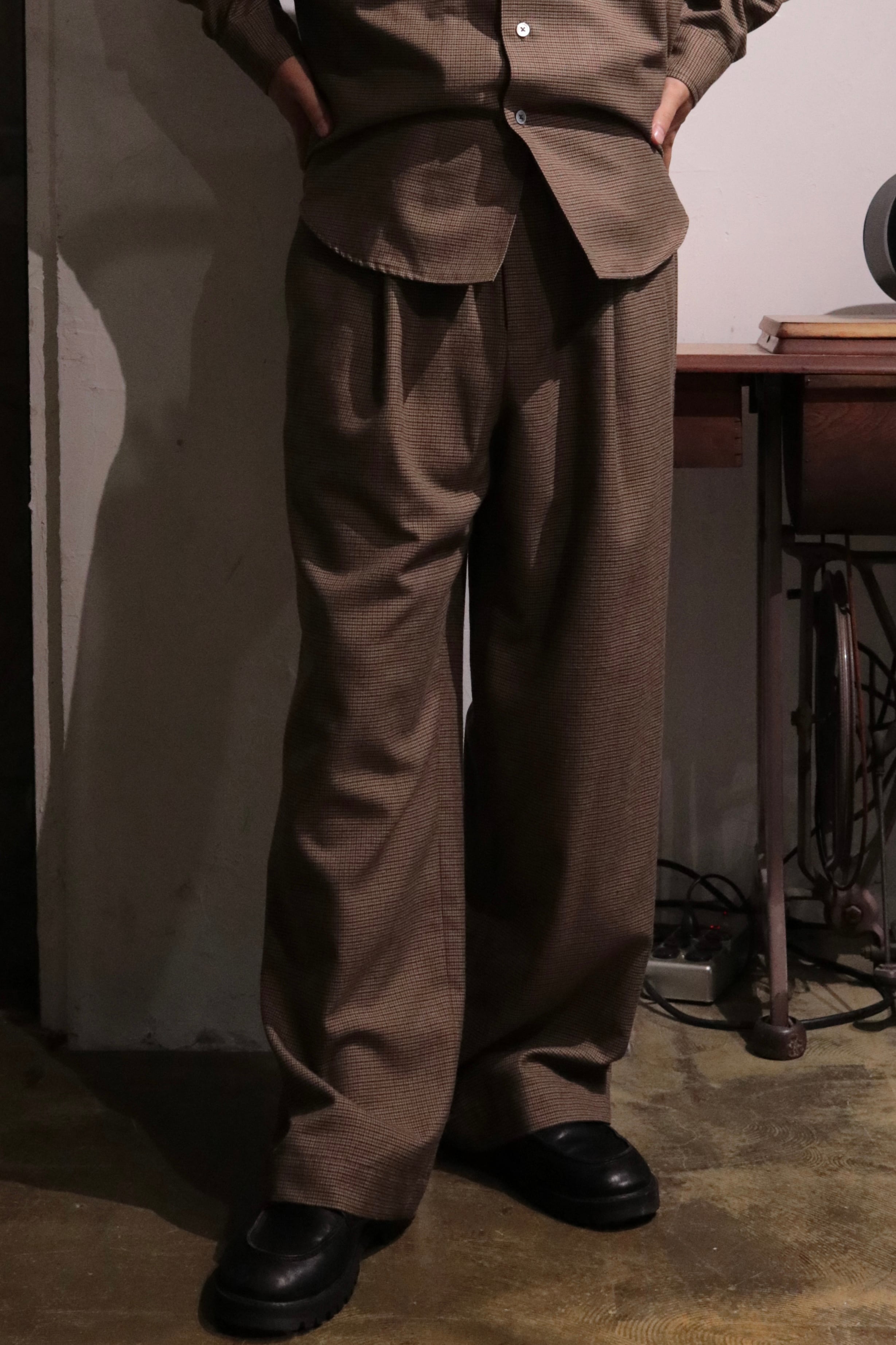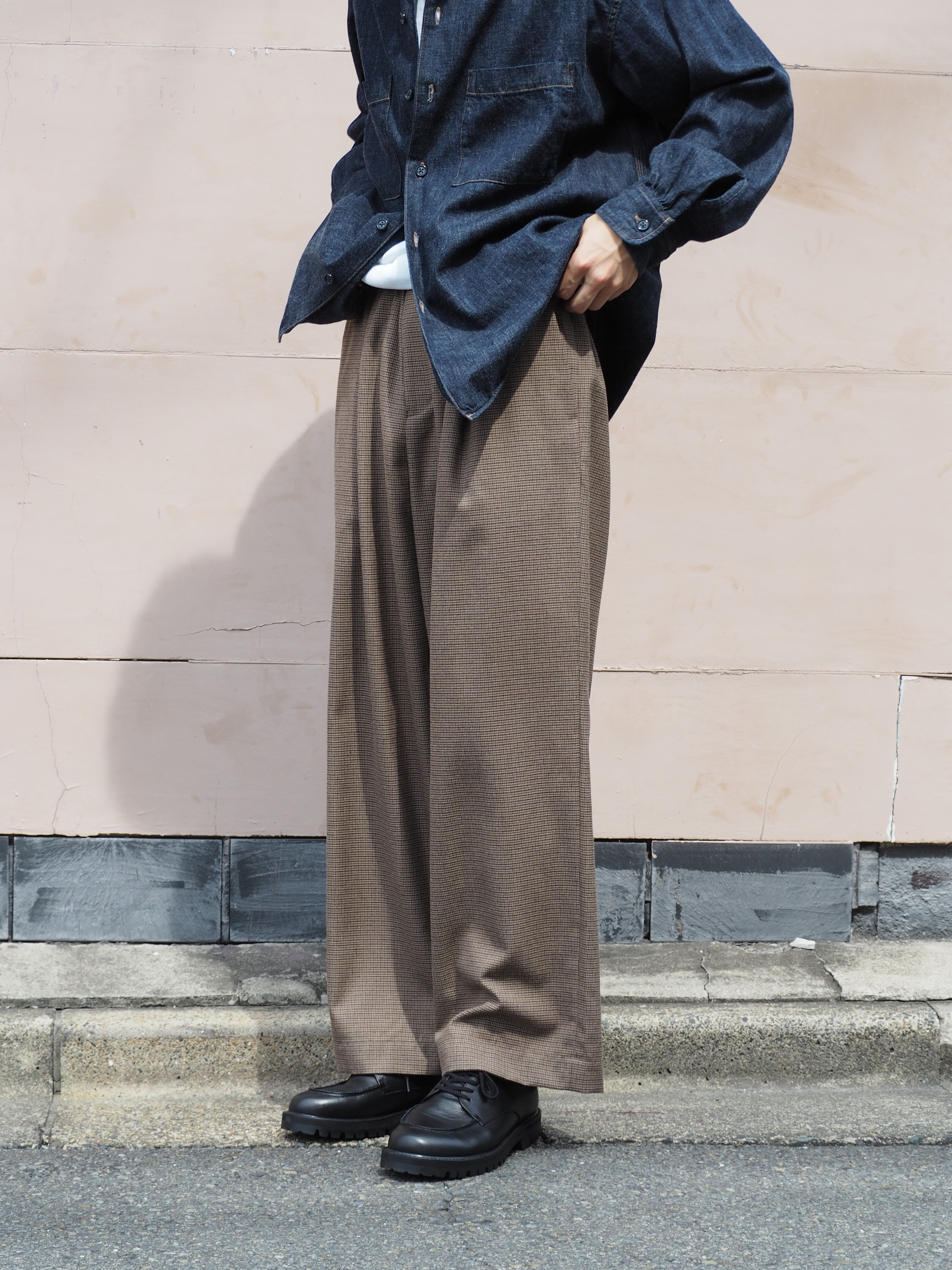 オリジナルガンクラブチェック地で製作したワイドシルエットのイージーパンツ.