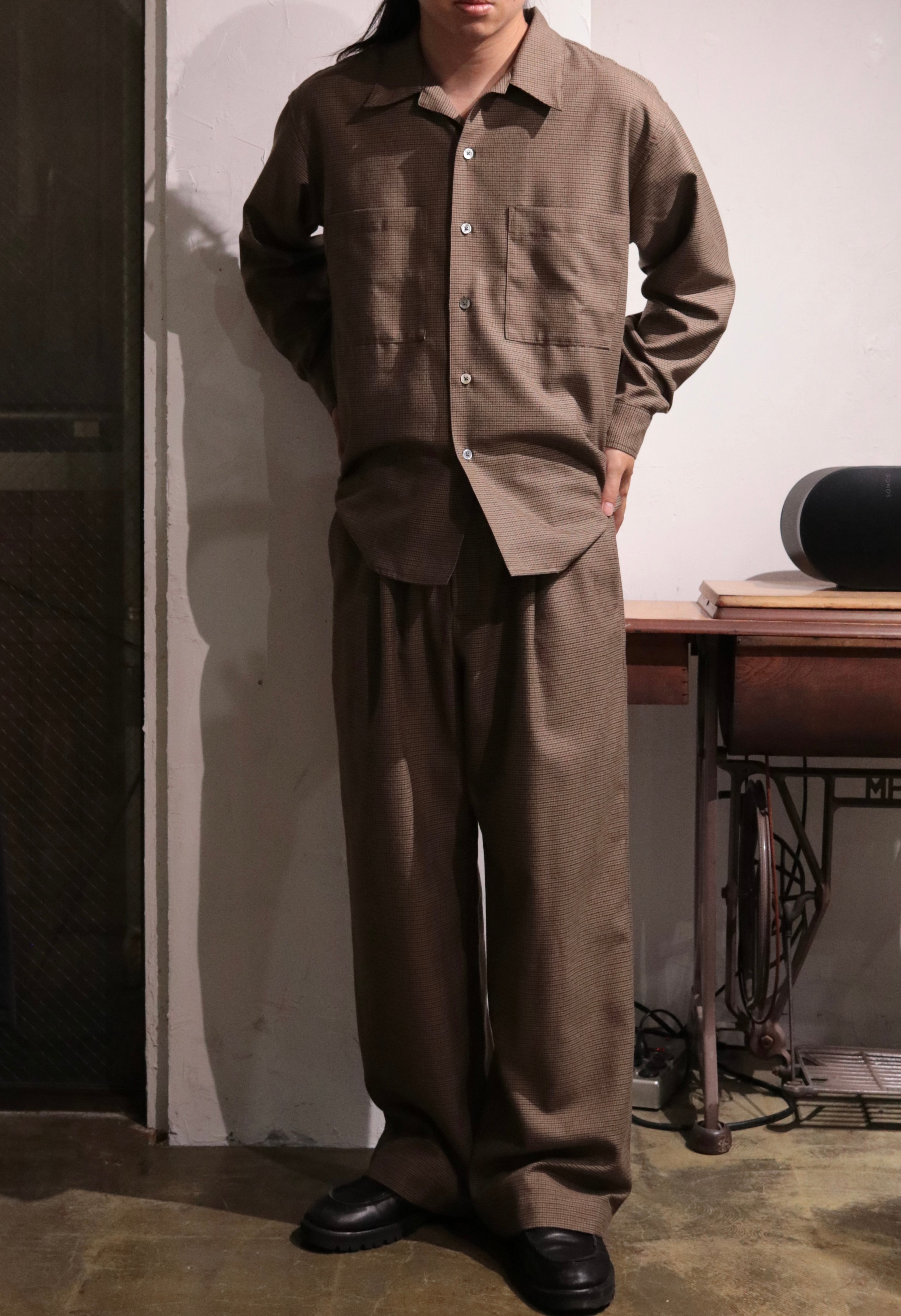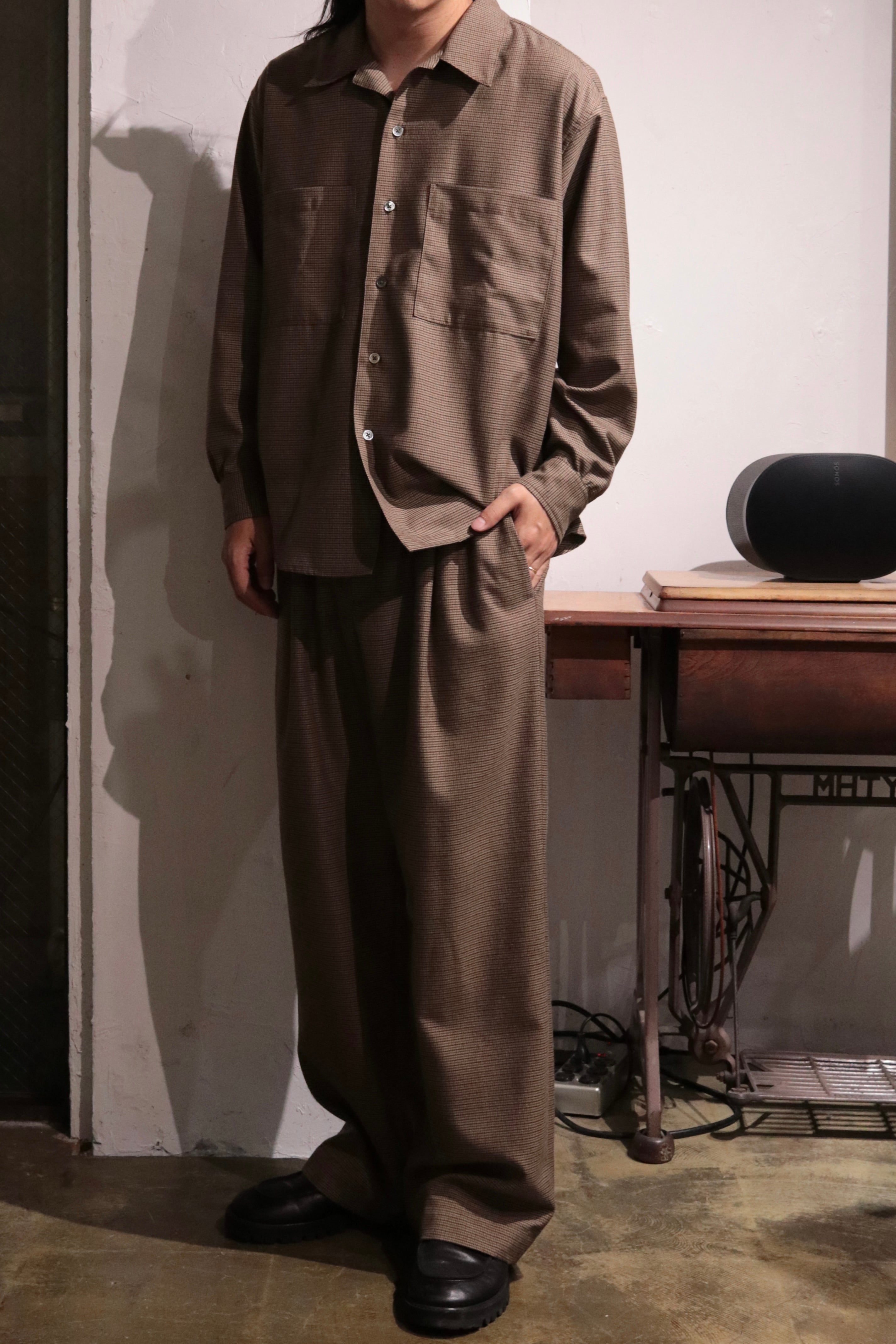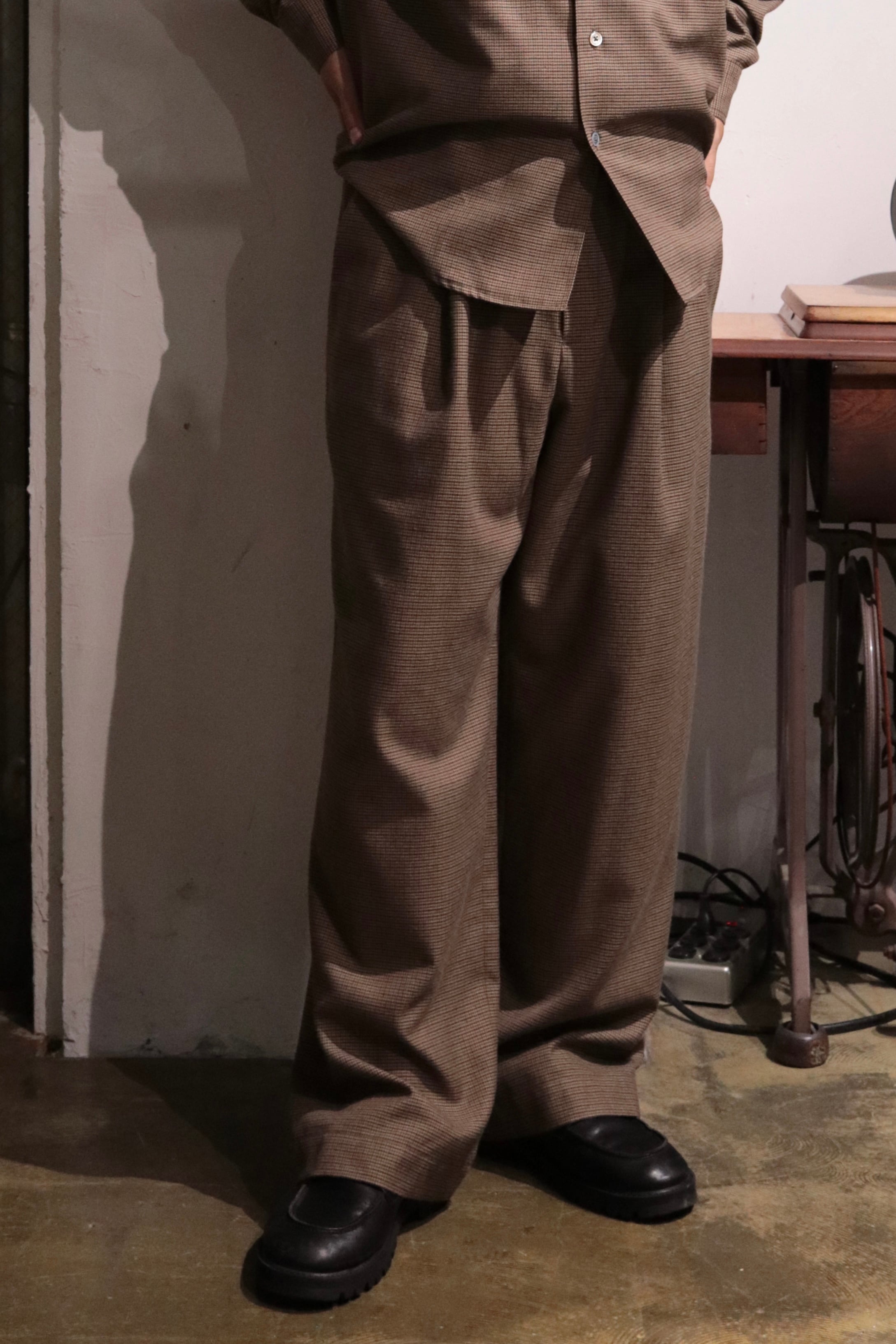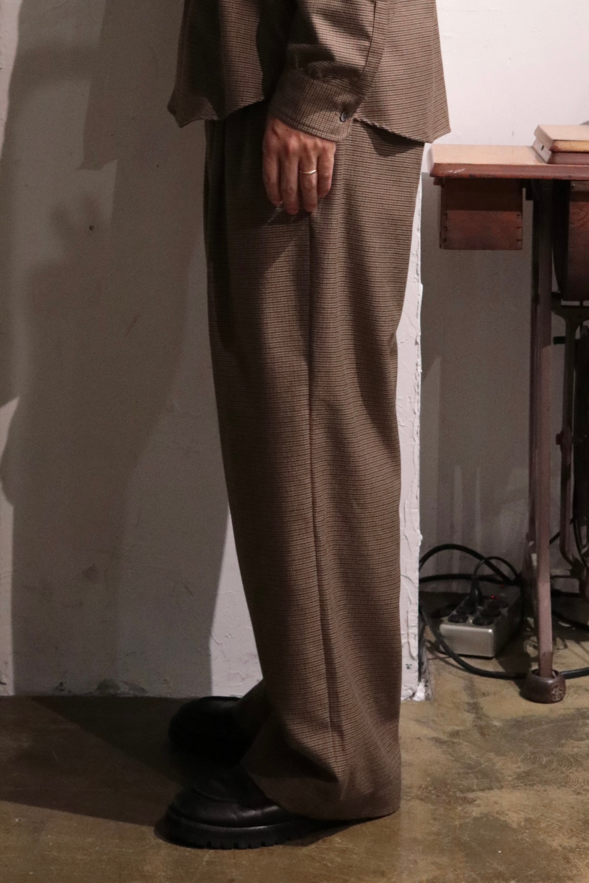 オリジナルガンクラブチェック地で製作したワイドシルエットのイージーパンツ.