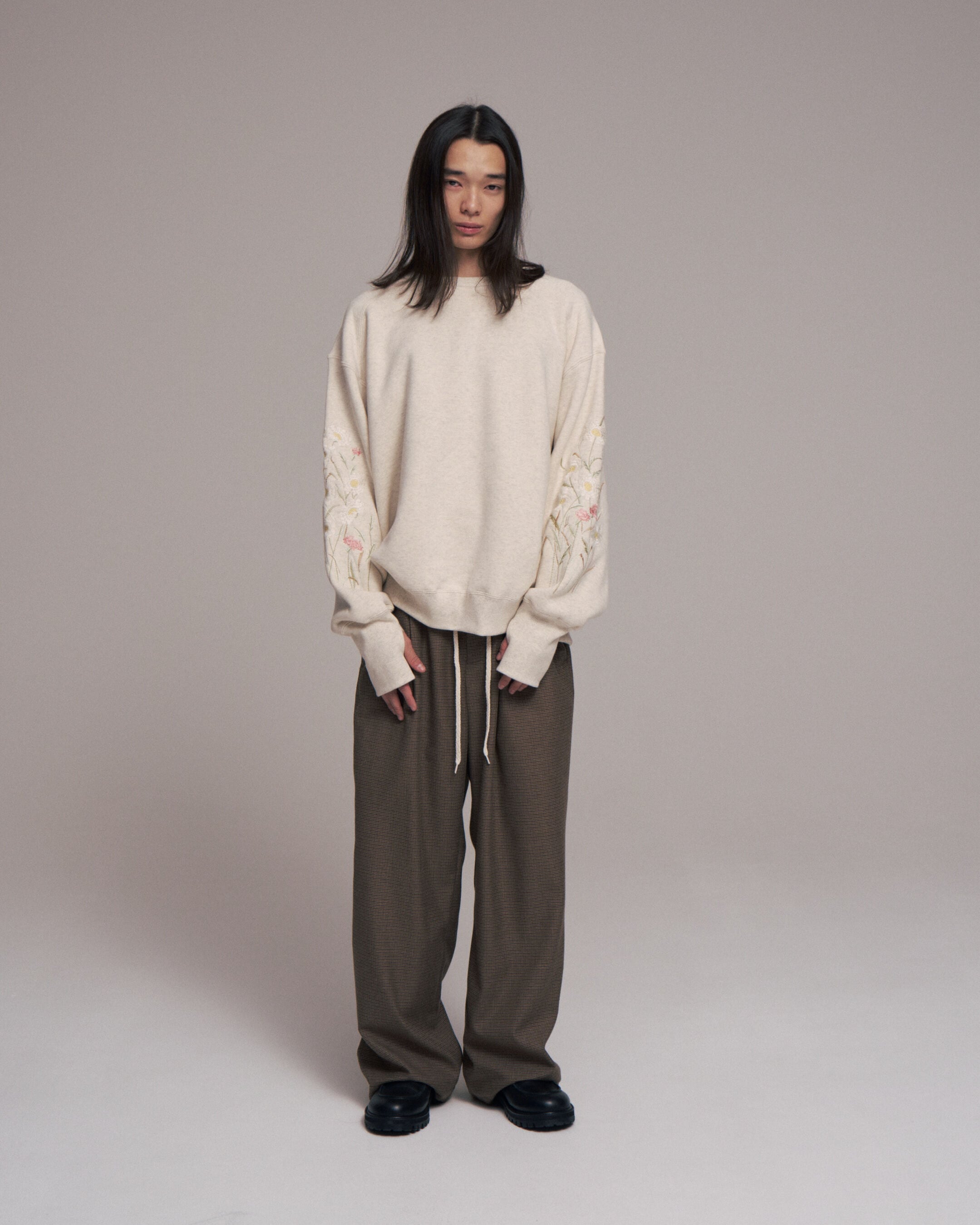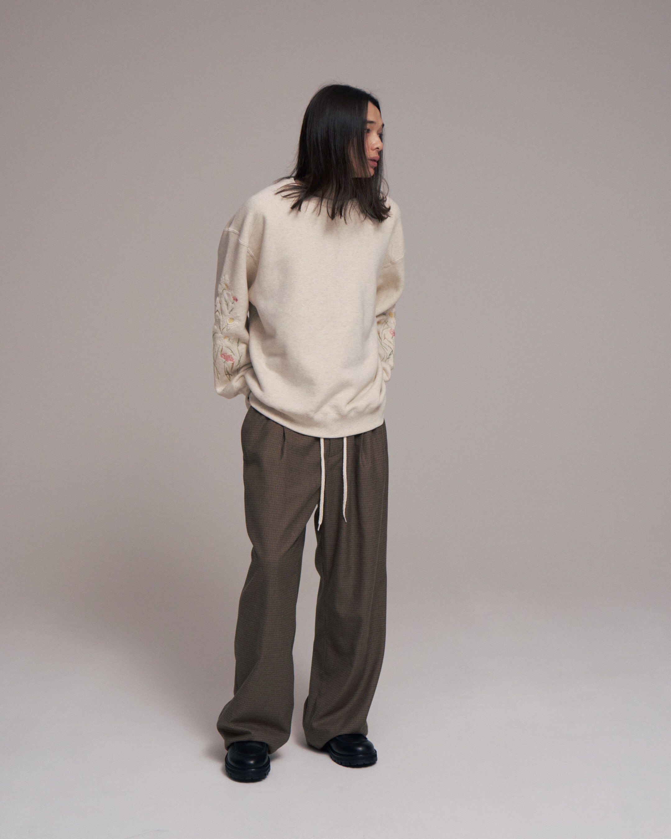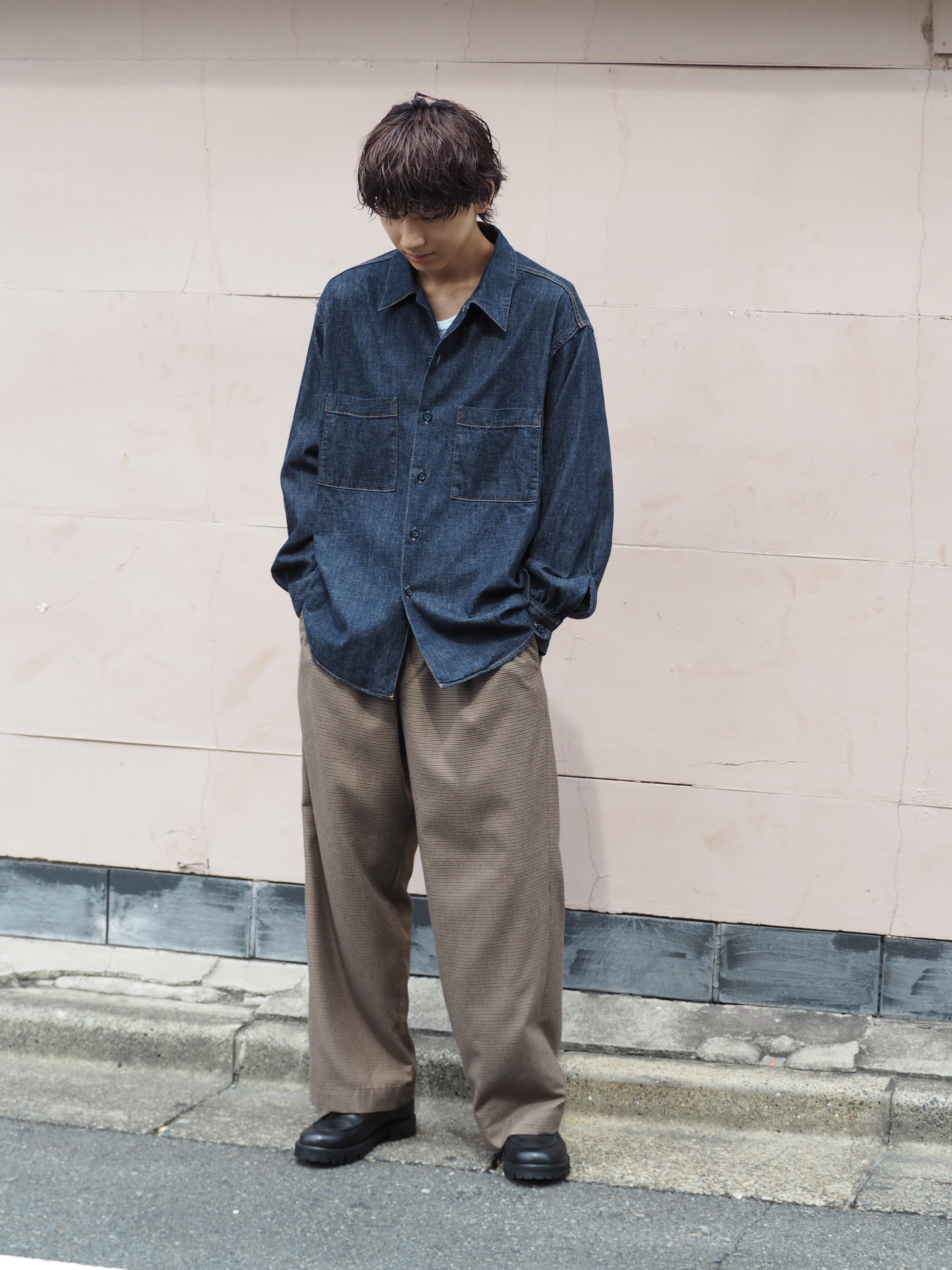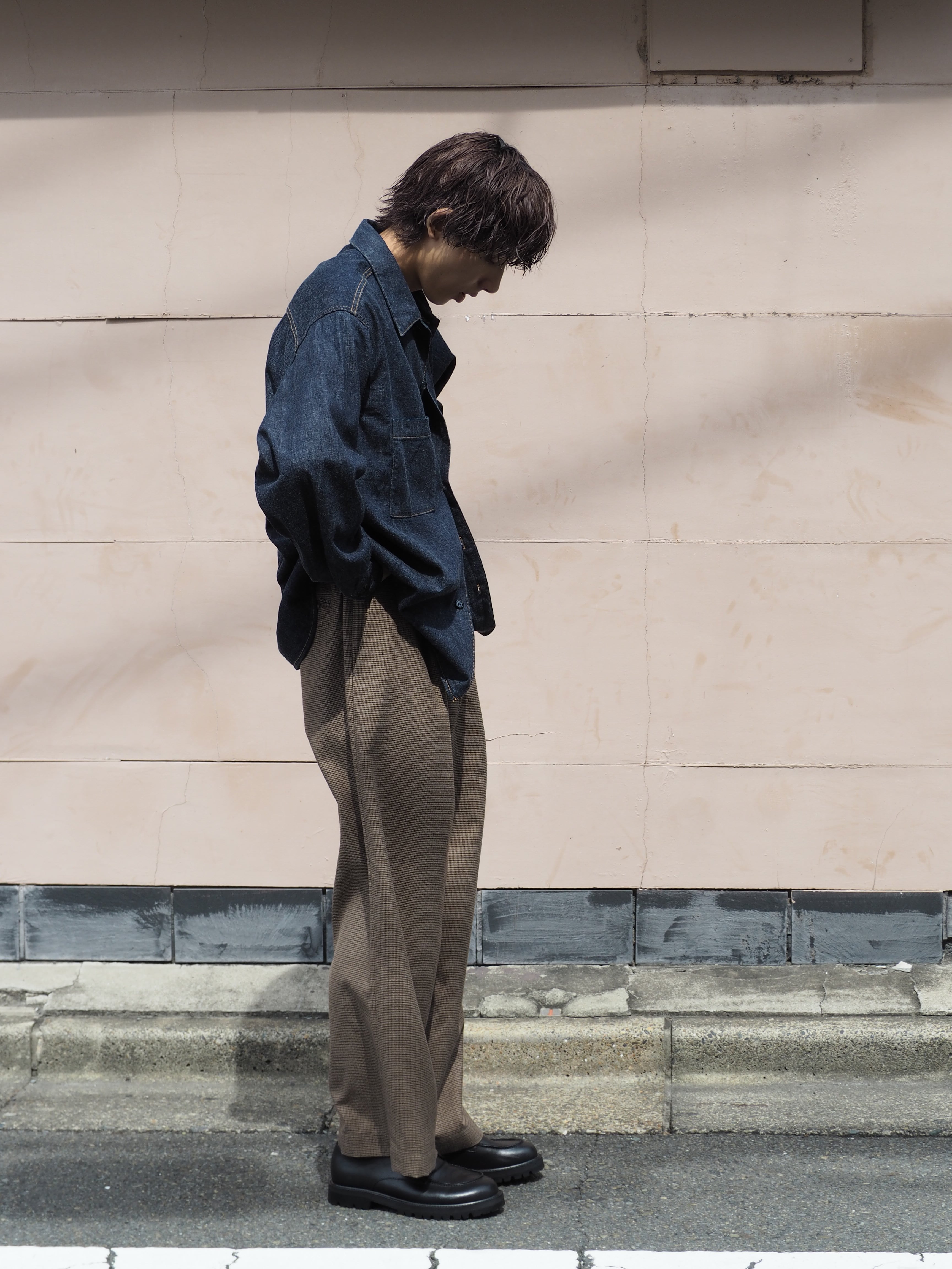 オリジナルガンクラブチェック地で製作したワイドシルエットのイージーパンツ.