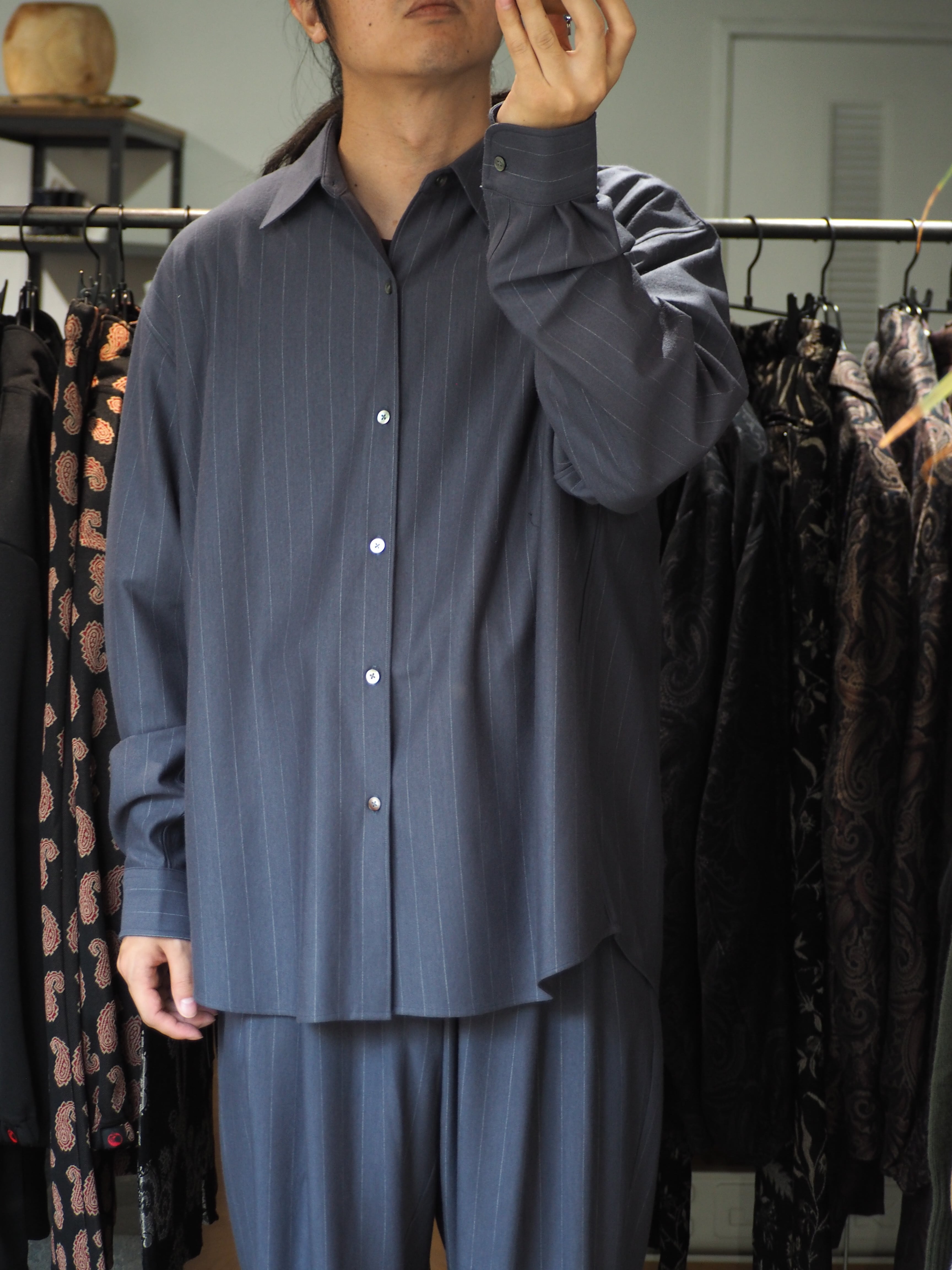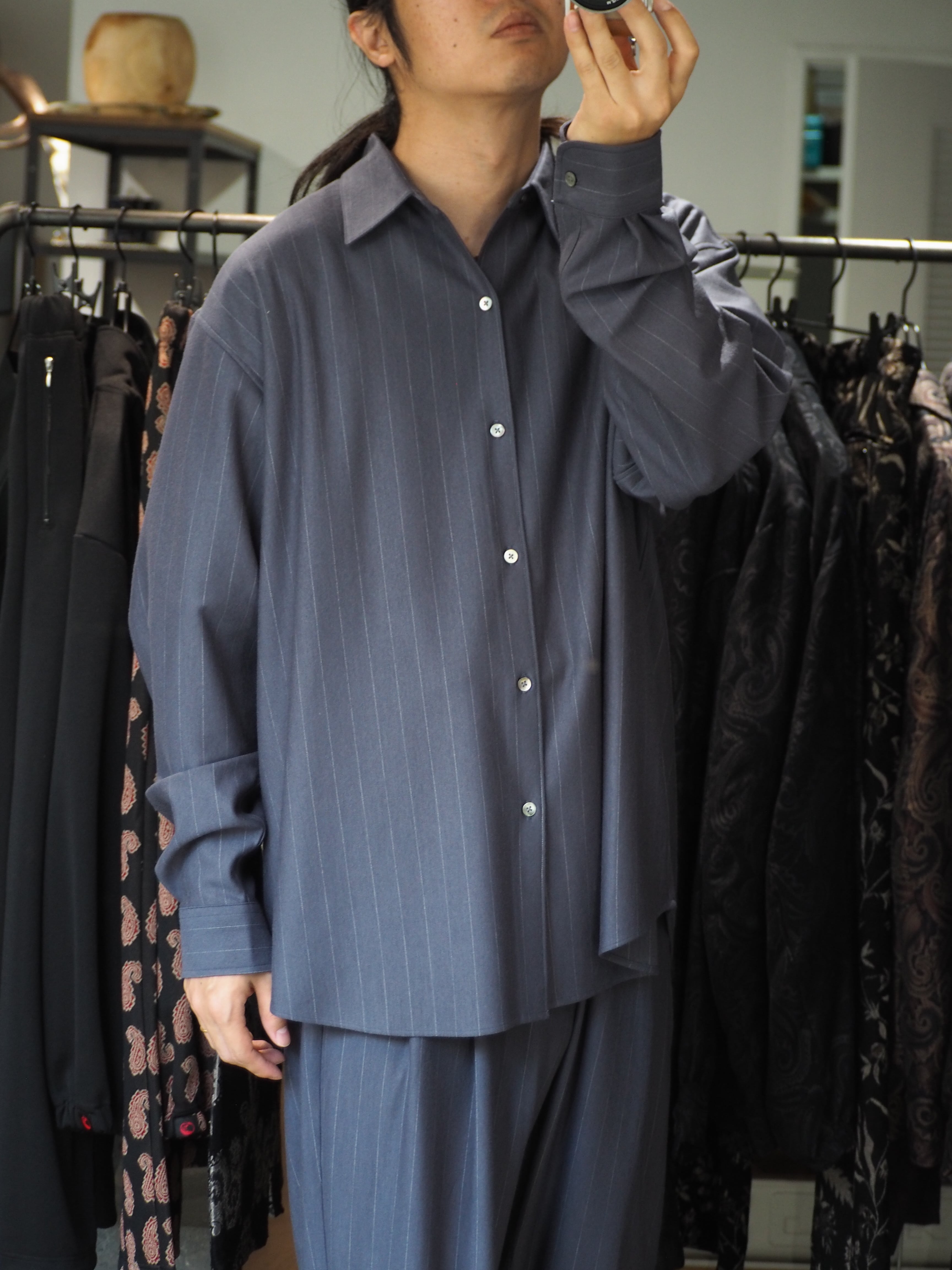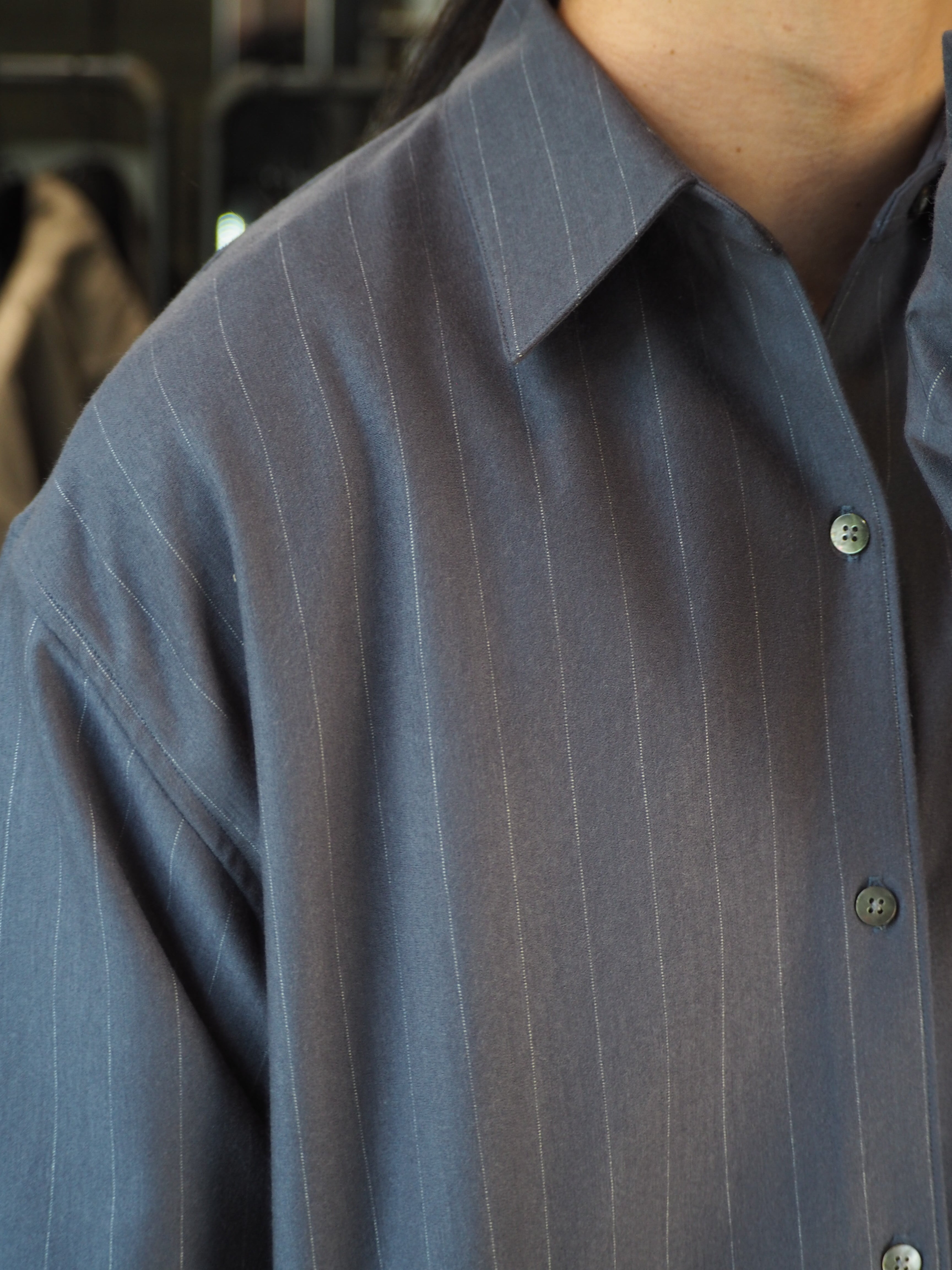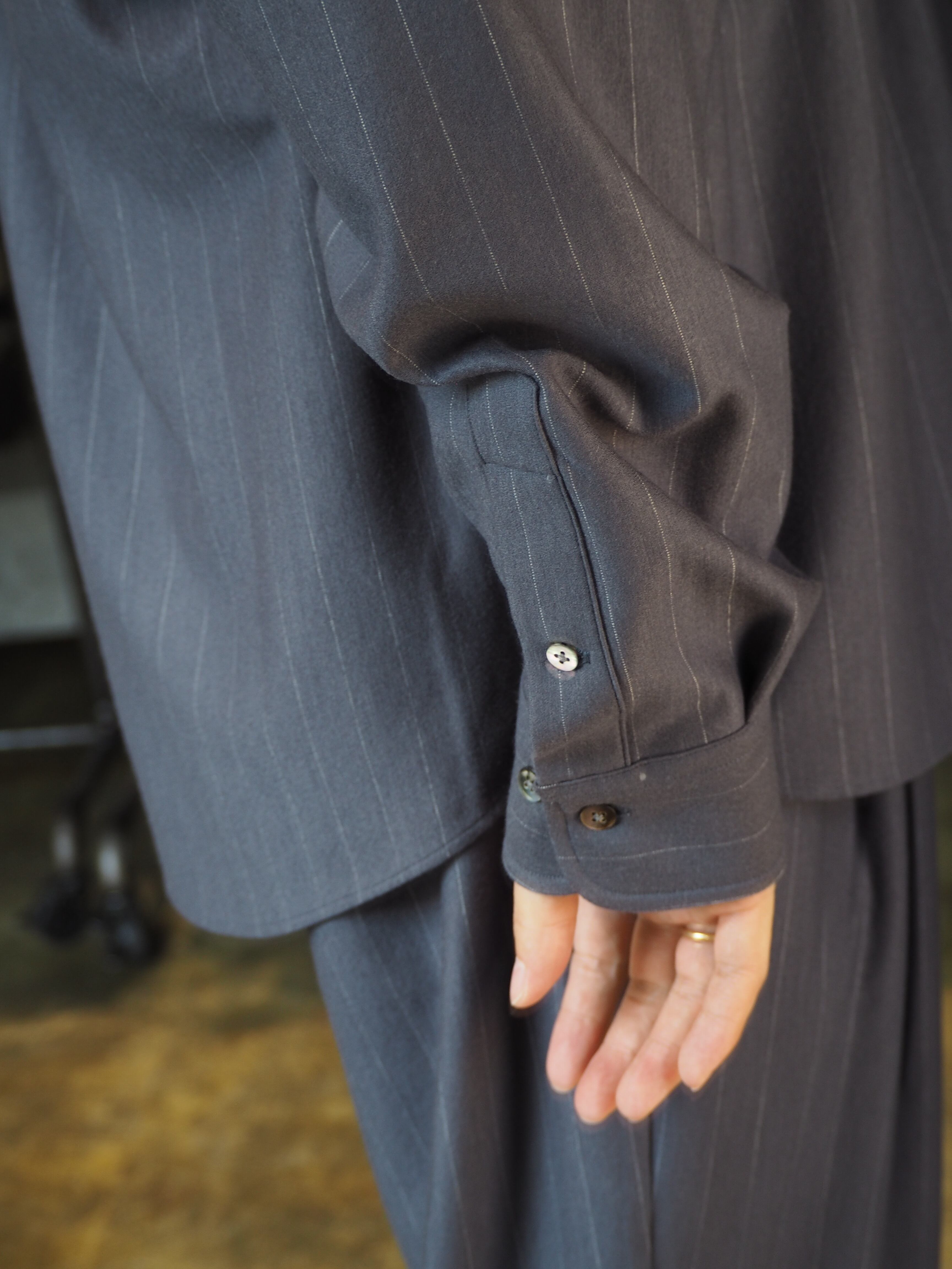 縫製は、ウールニットを縫うことができる最大の細かさで運針を走らせたドレス仕様シャツ。ヨークと袖の始末はドレスシャツ仕様に仕上げ、インナーでもアウターでも着用頂ける仕様です。程よいゆるさのシルエットはどのようなシーンでも着用頂けます。