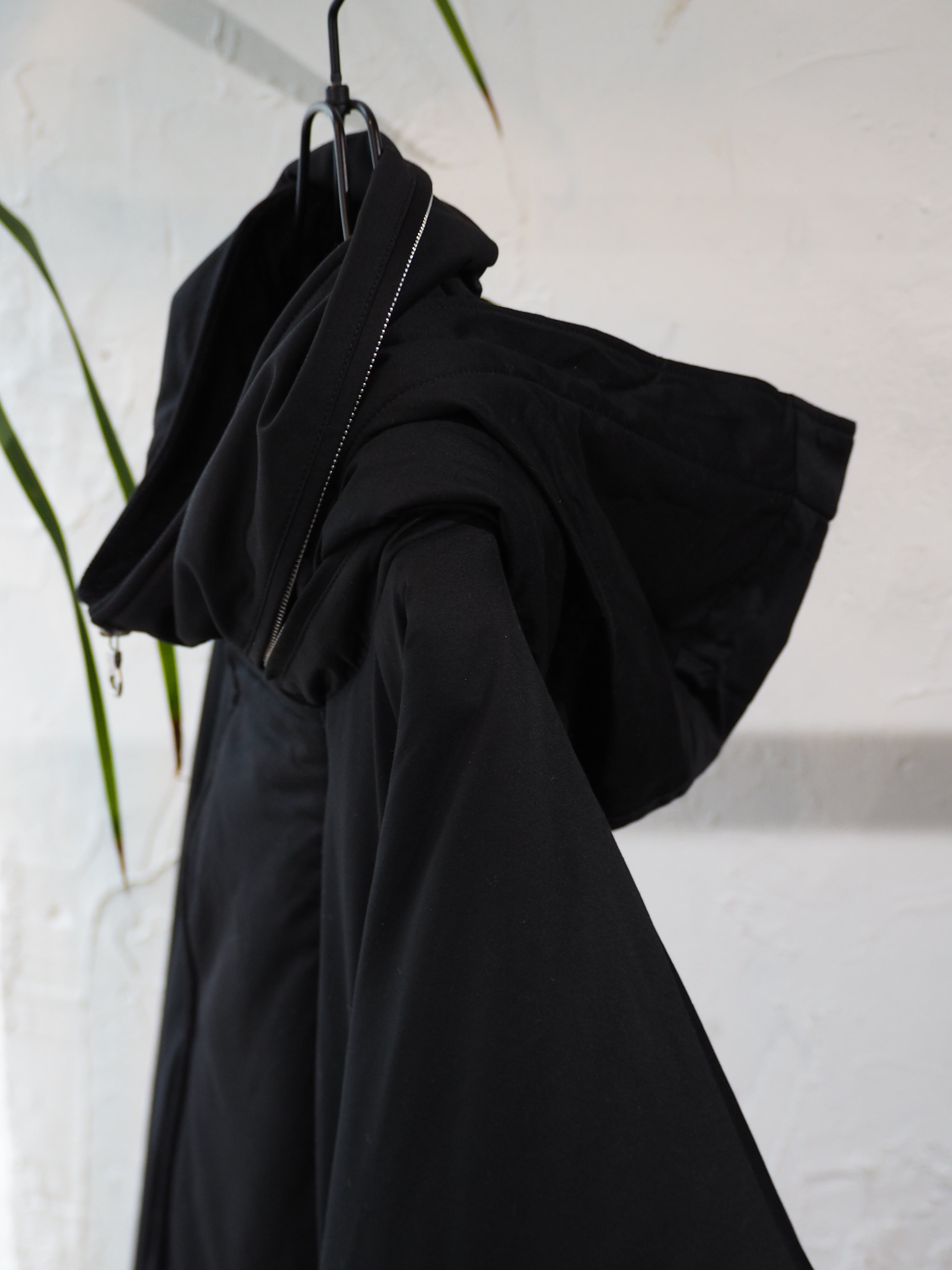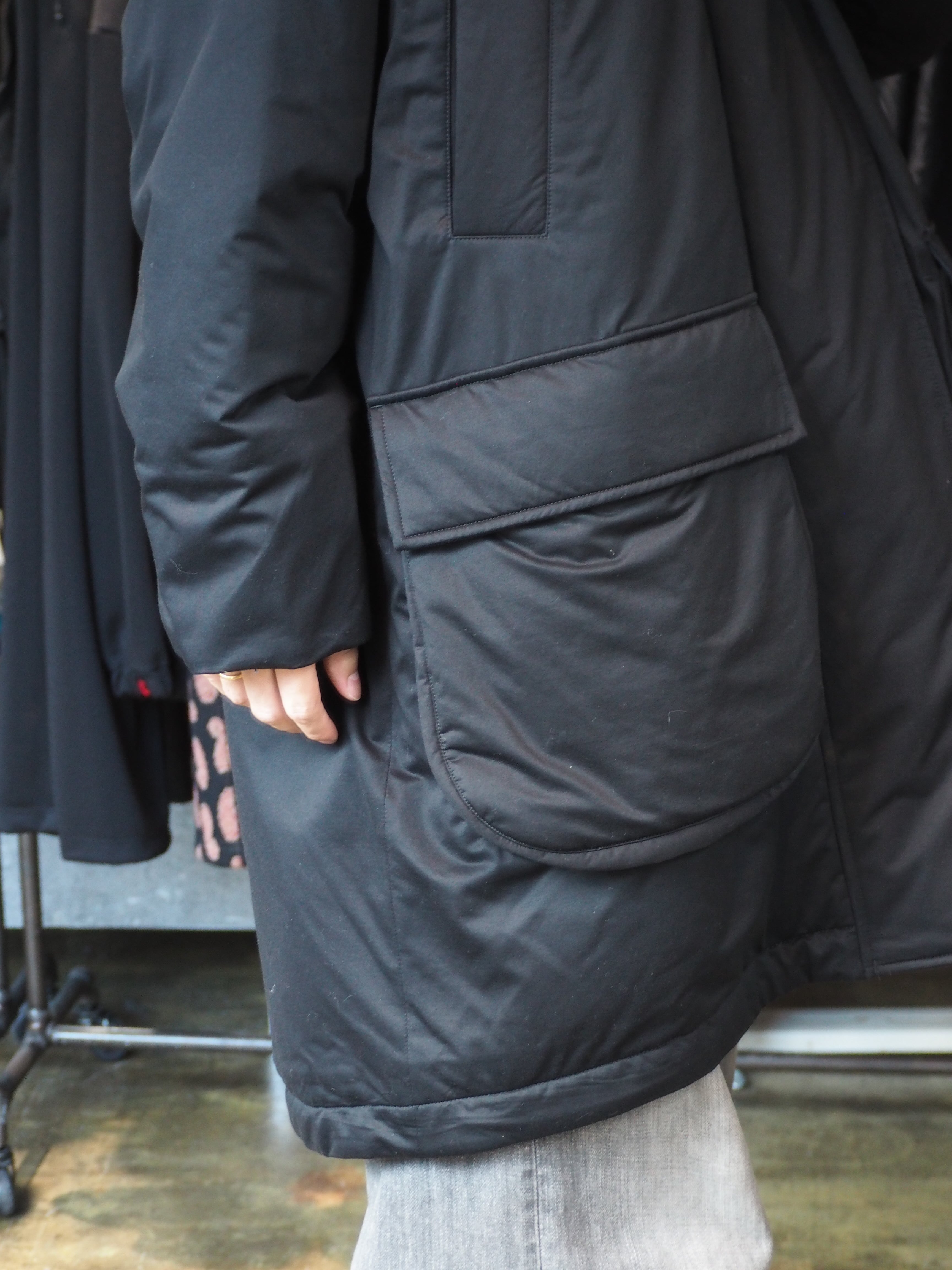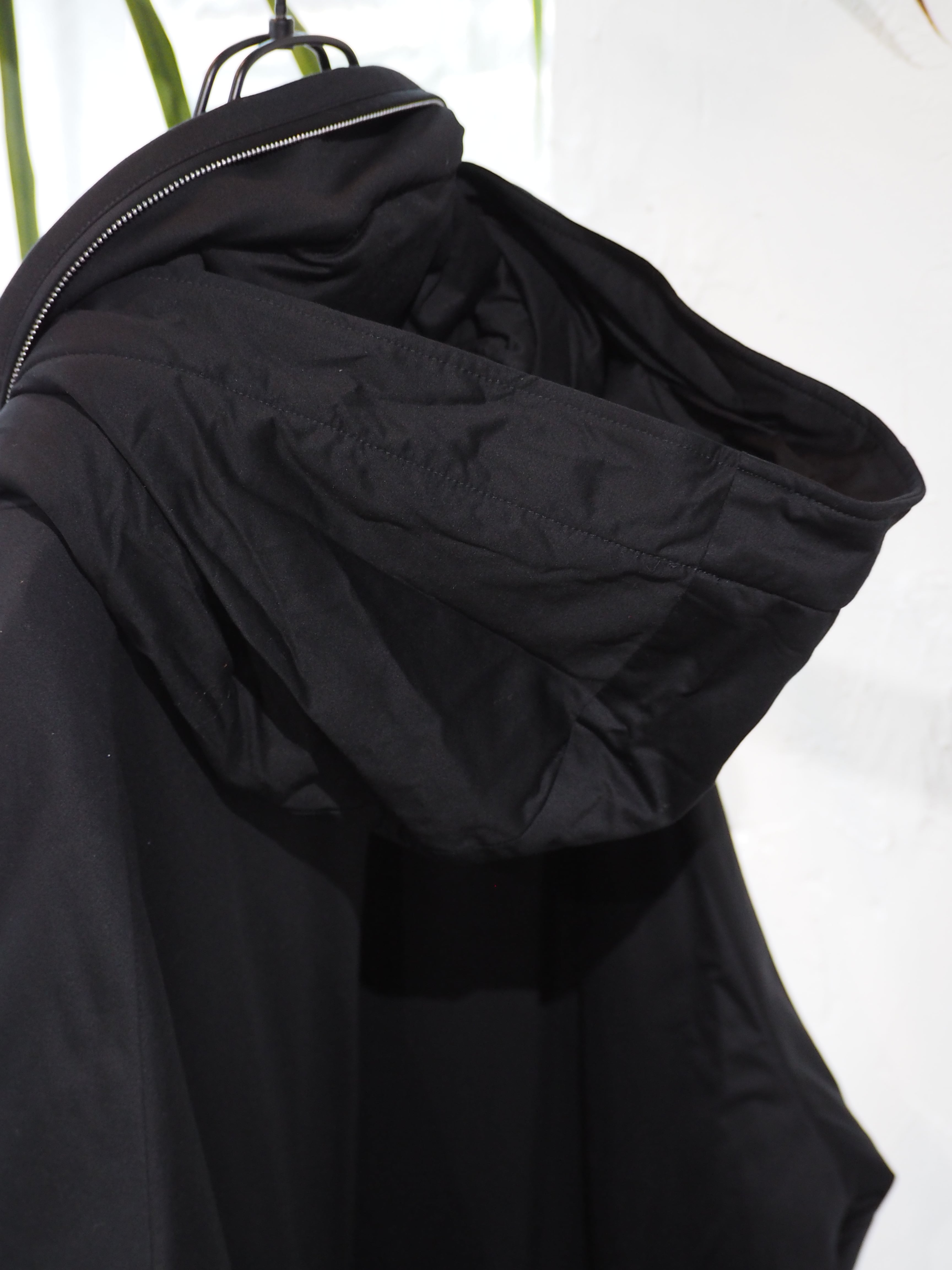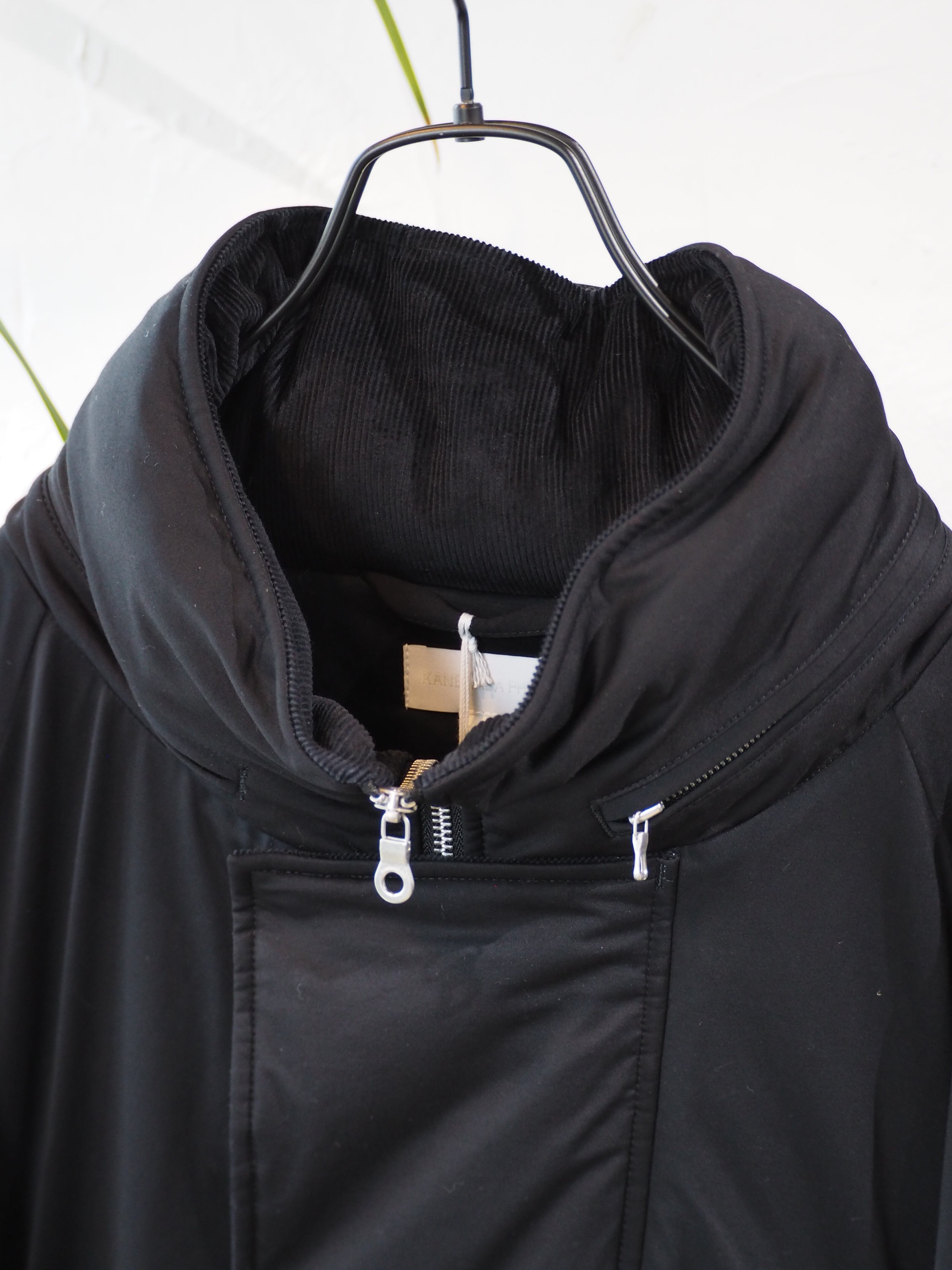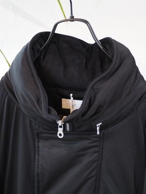 ラグラン仕様で巾をしっかりとった中綿コート。襟元には、フードも搭載しており2way仕様です。襟裏、袖裏、ポケット裏にコール天を部分使いし、デザインアクセントにしております。