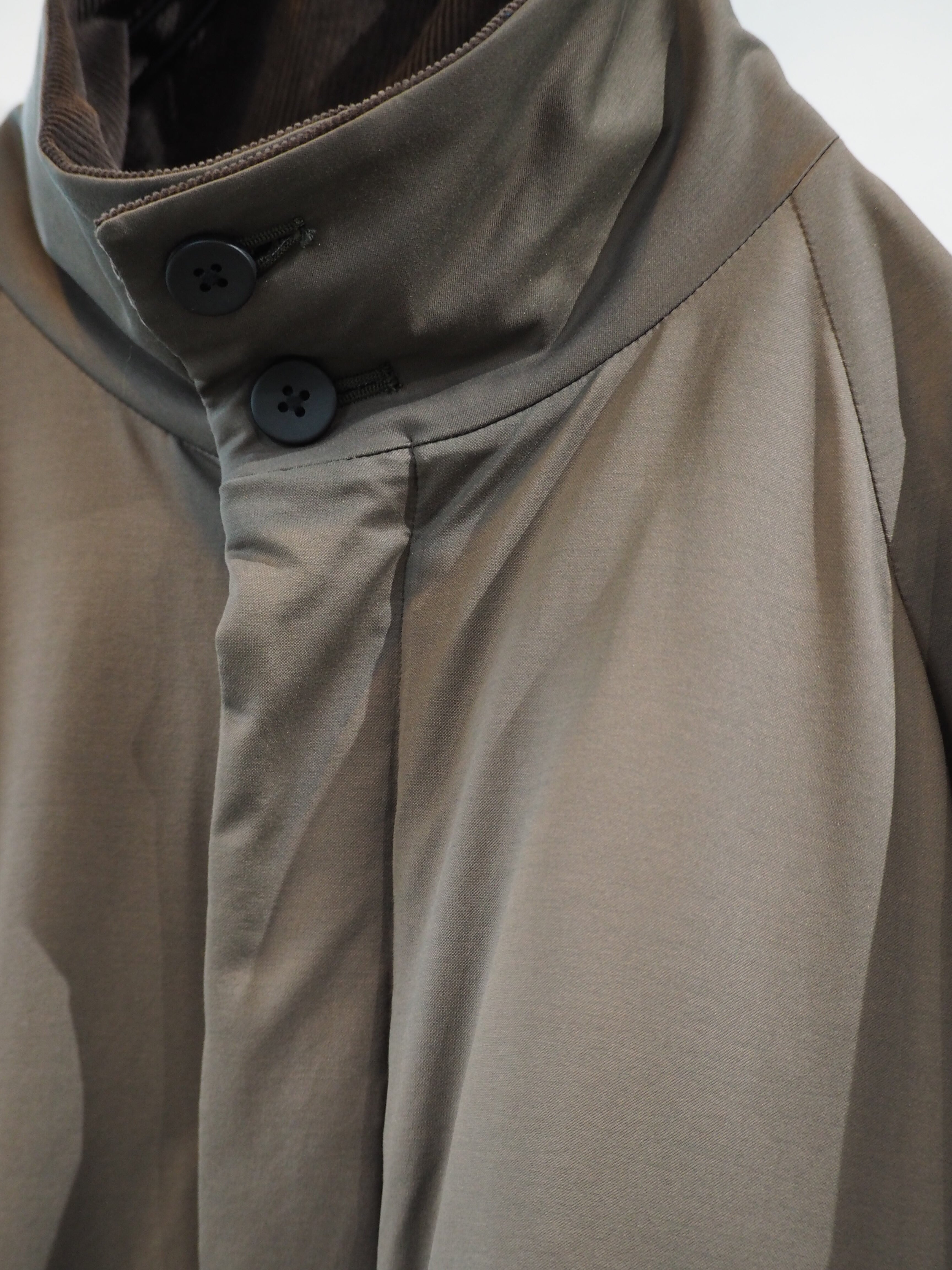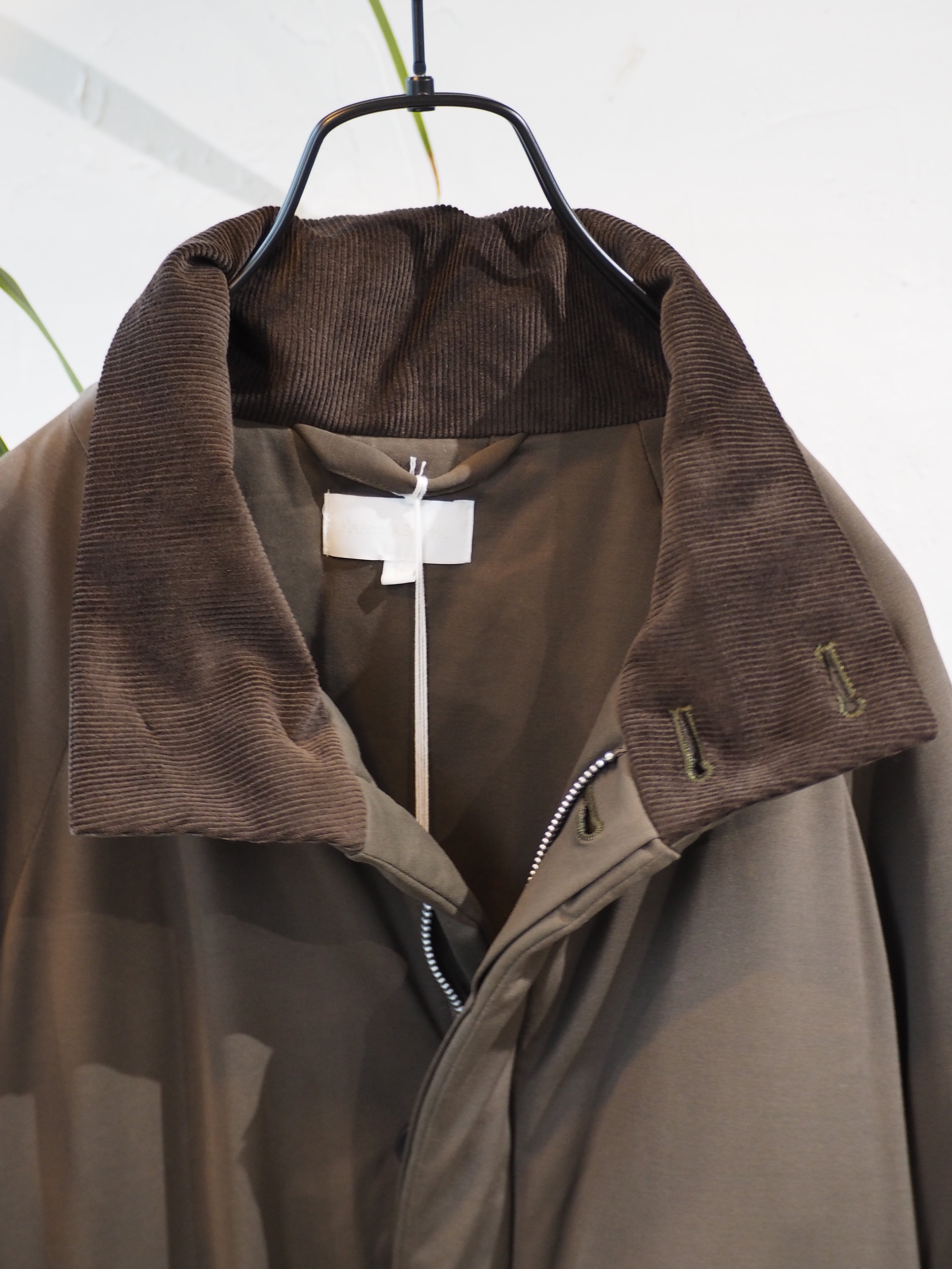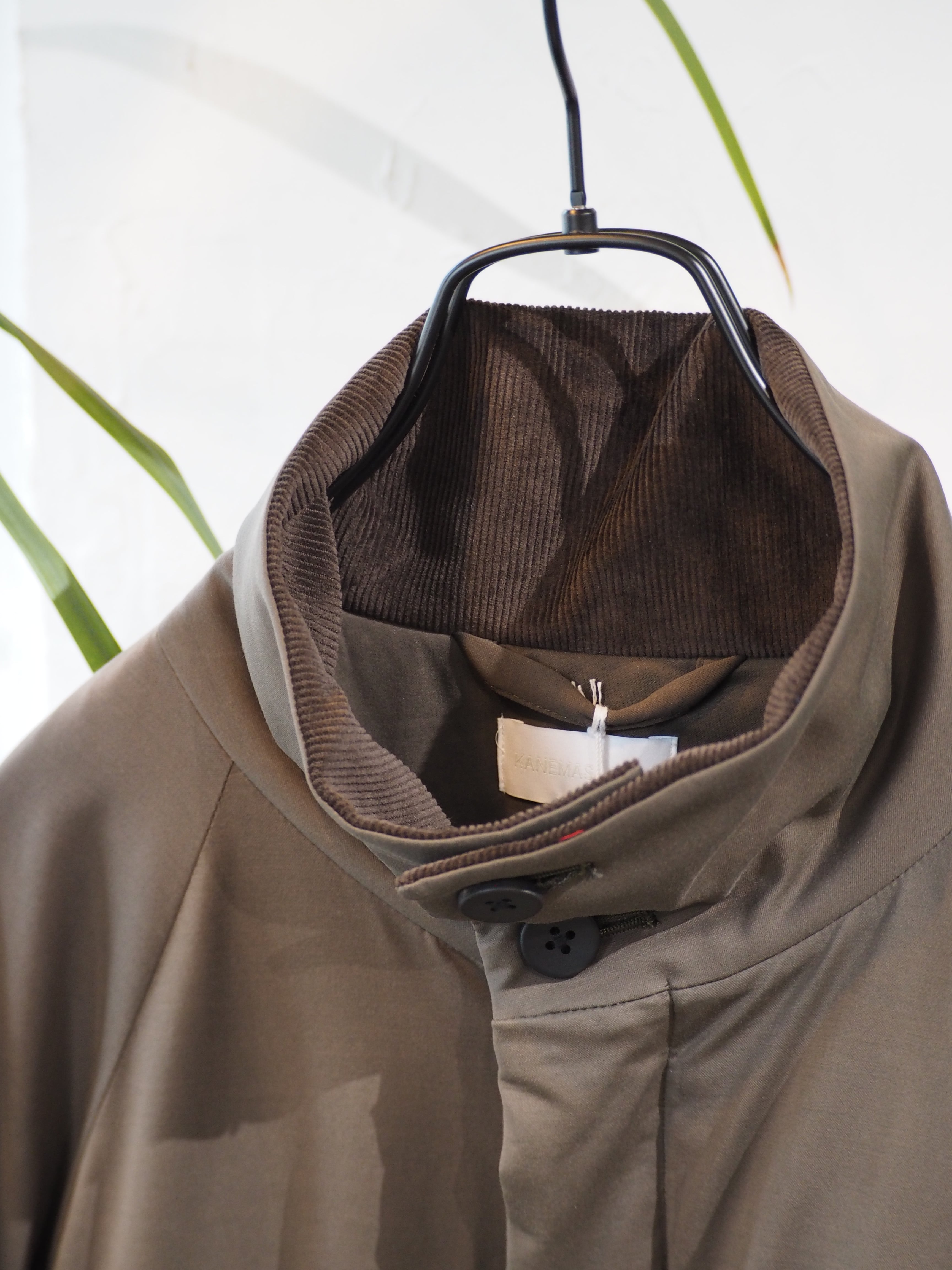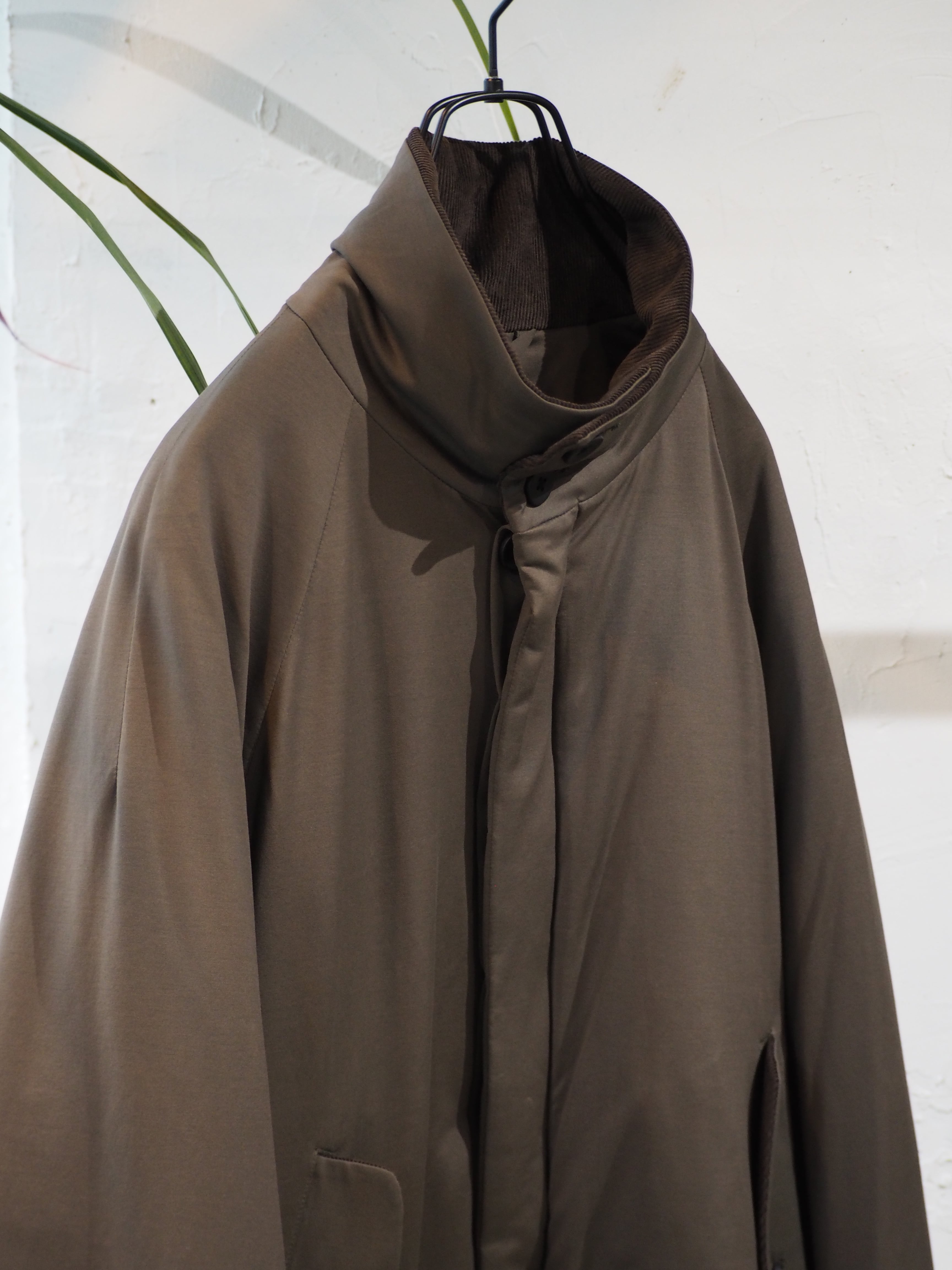 ラグラン仕様で巾をしっかりとったブルゾン。秋口は、アウター真冬はライトアウターとしても着用頂ける1着。襟を立てても畳んでもちょうどよいバランスで首元を作成しました。部分使いで、コール天を使いデザインアクセントにしております。