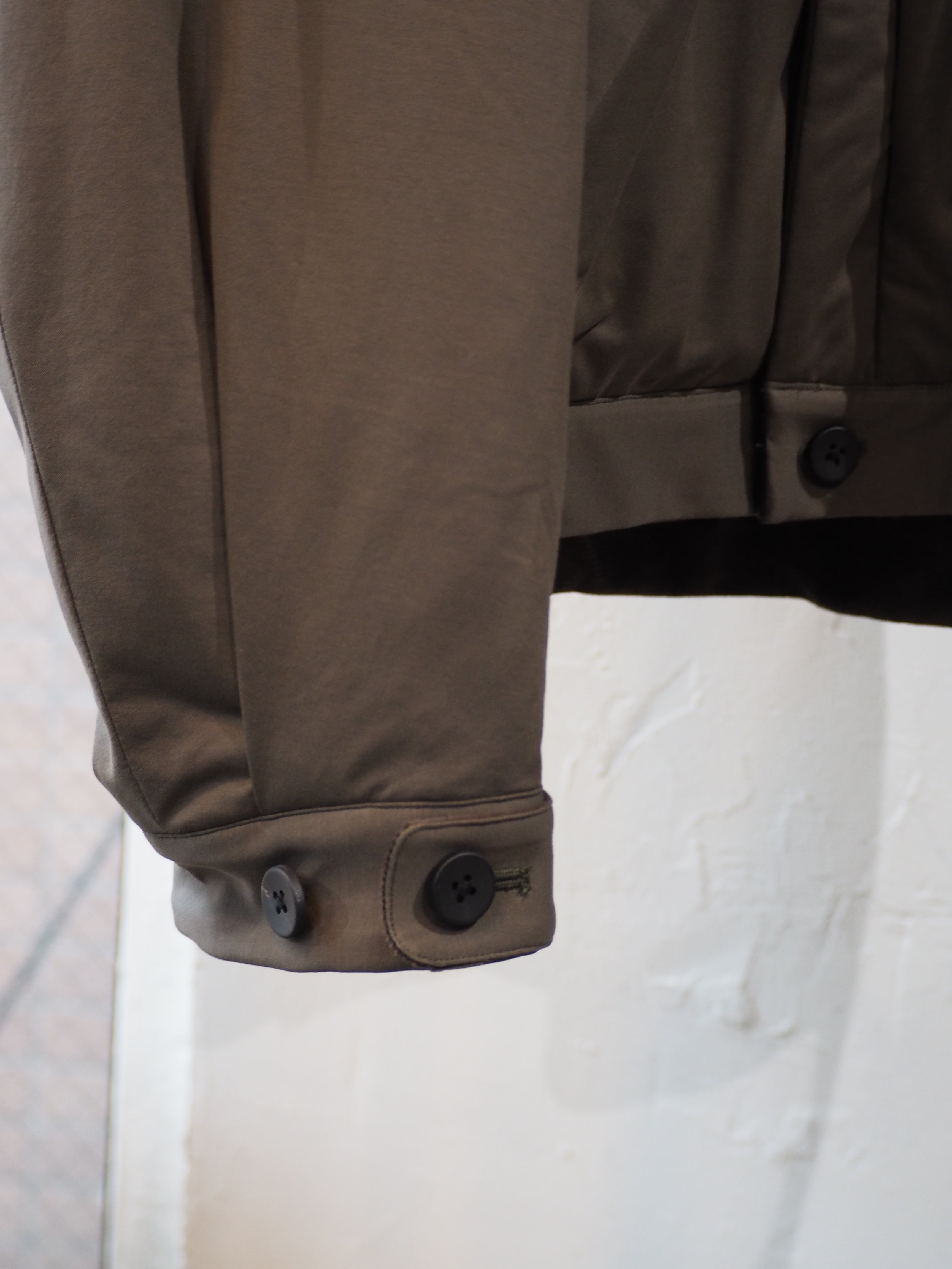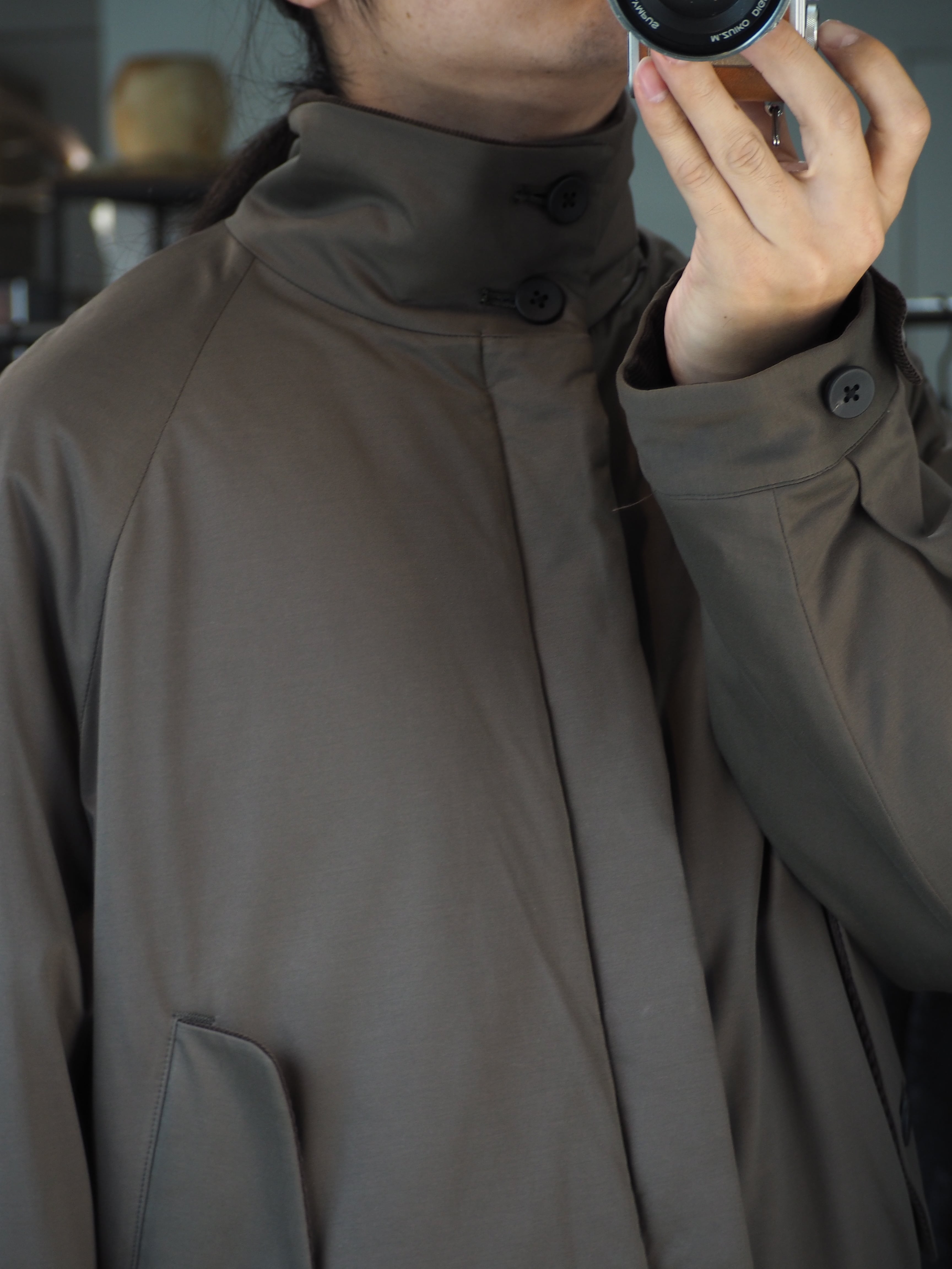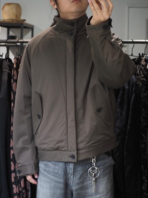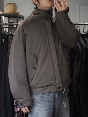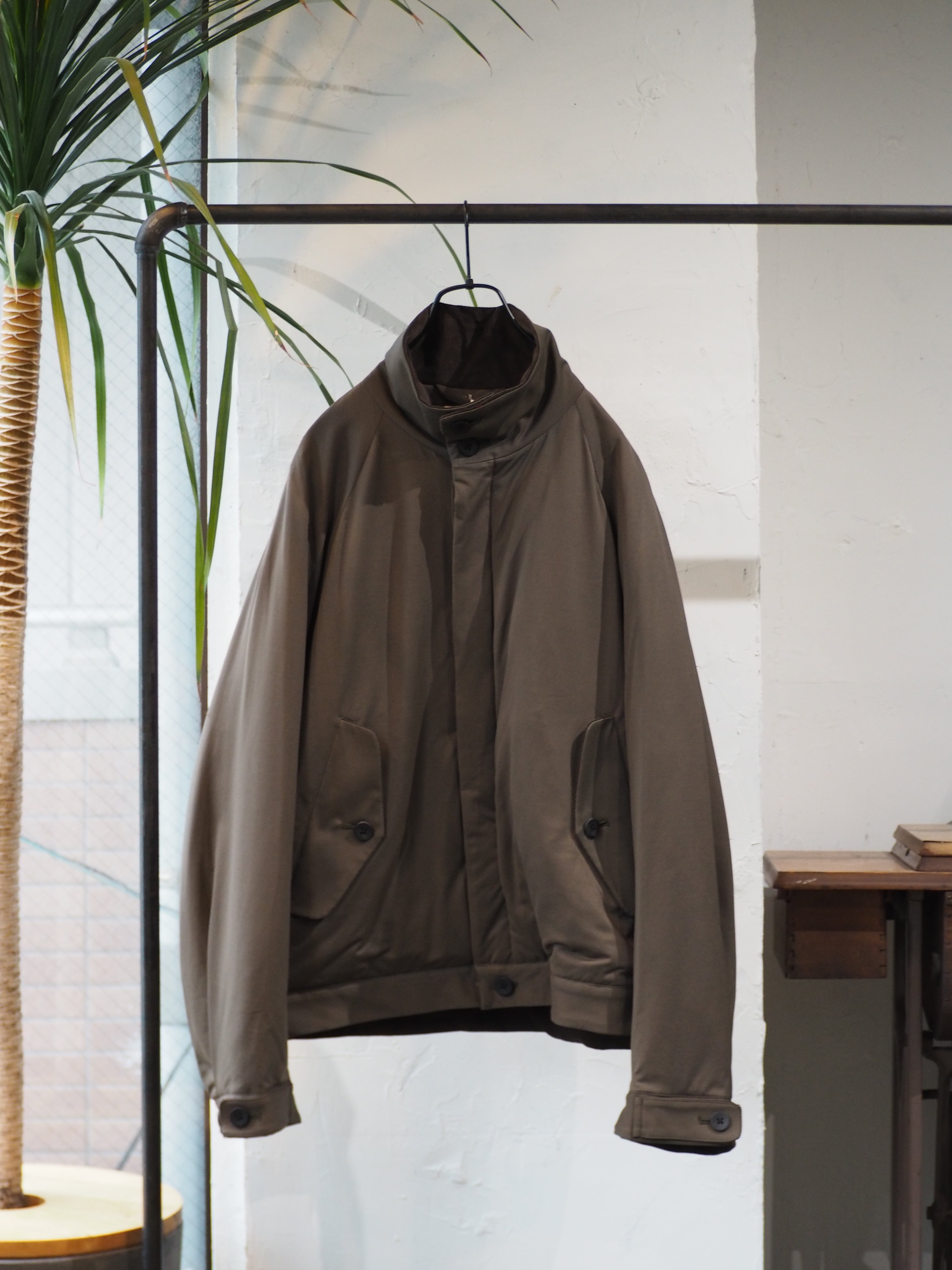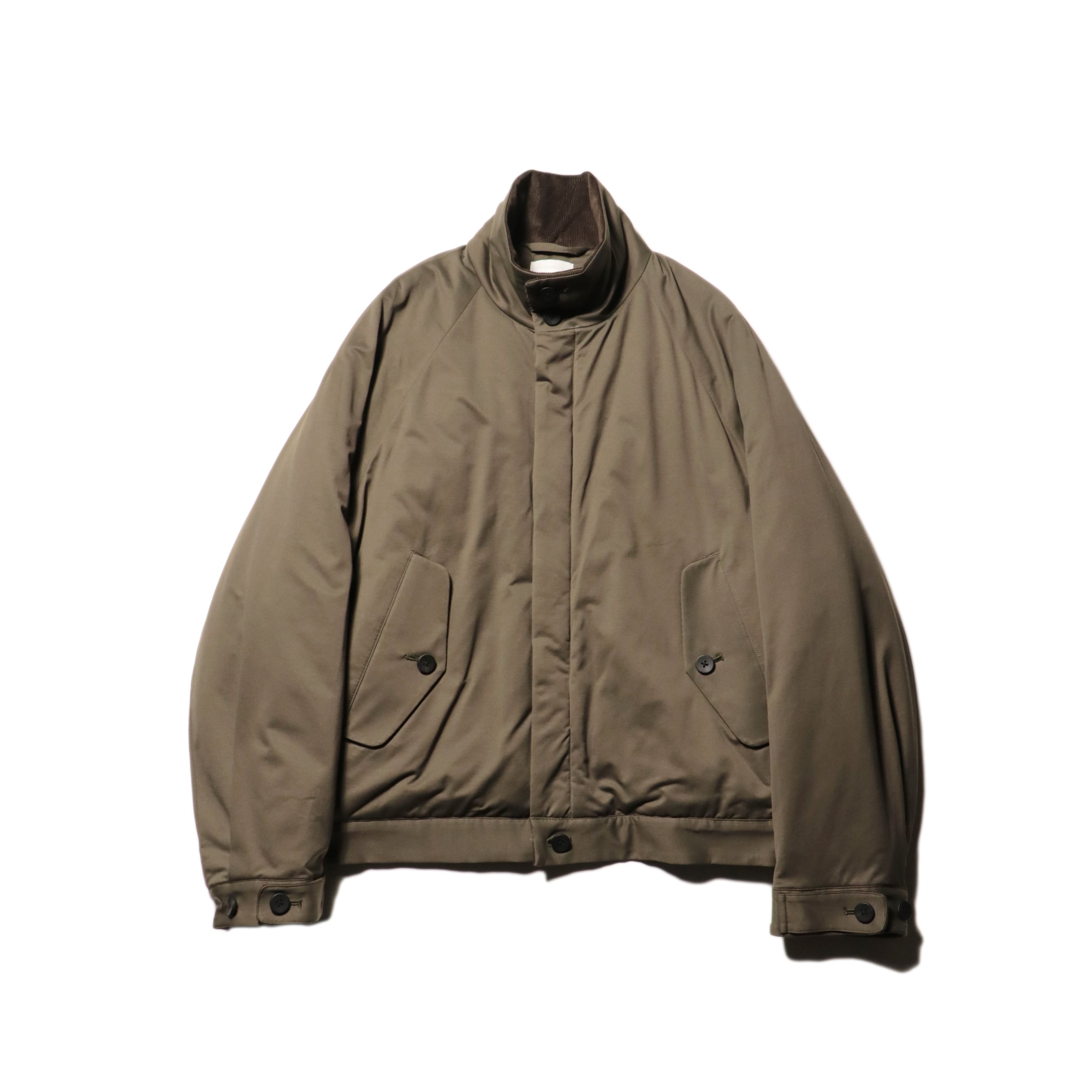 ラグラン仕様で巾をしっかりとったブルゾン。秋口は、アウター真冬はライトアウターとしても着用頂ける1着。襟を立てても畳んでもちょうどよいバランスで首元を作成しました。部分使いで、コール天を使いデザインアクセントにしております。