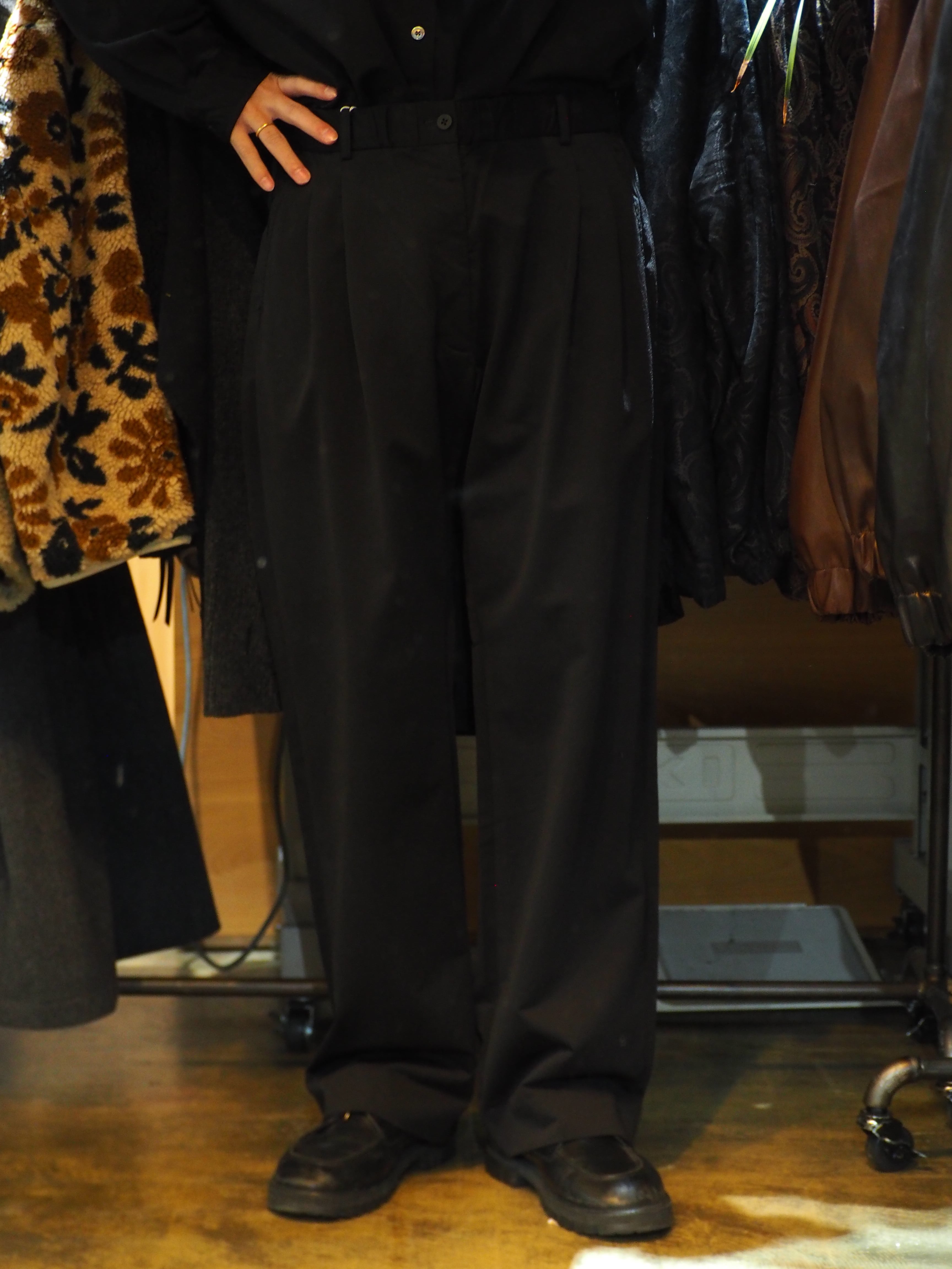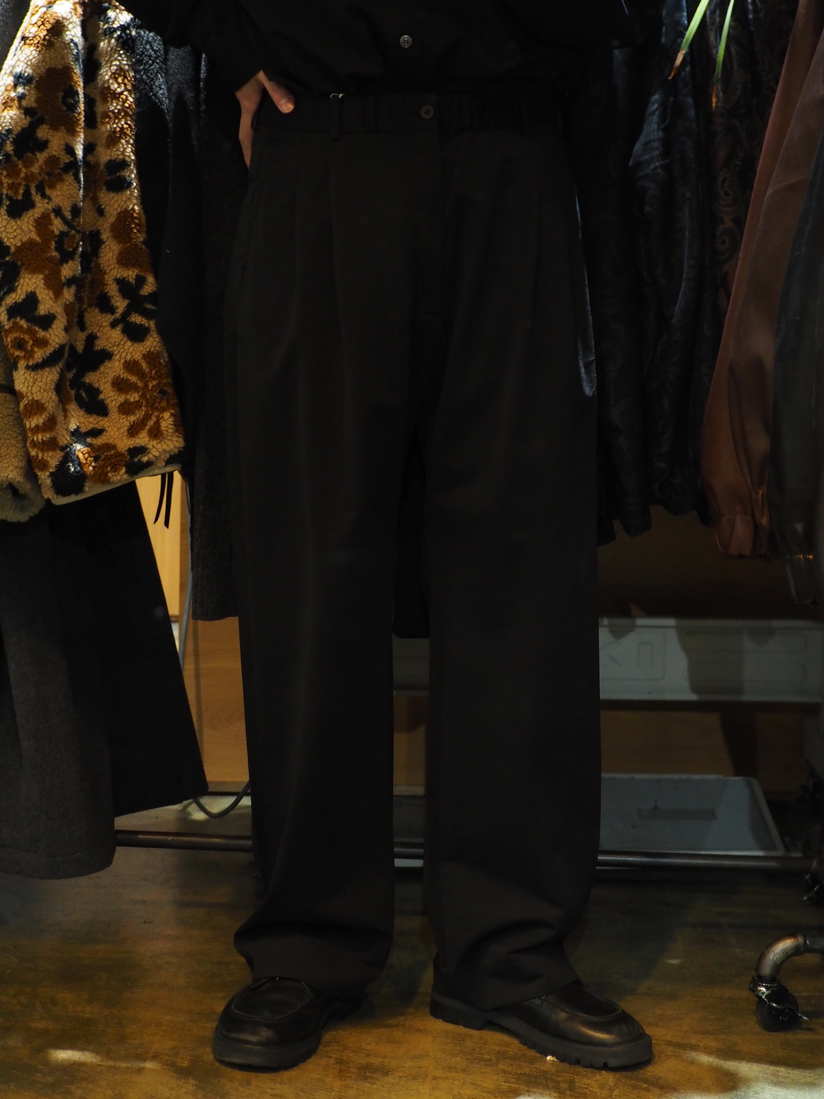 深くタックが入り、ウエストをゴムで仕上げたイージーパンツになります。