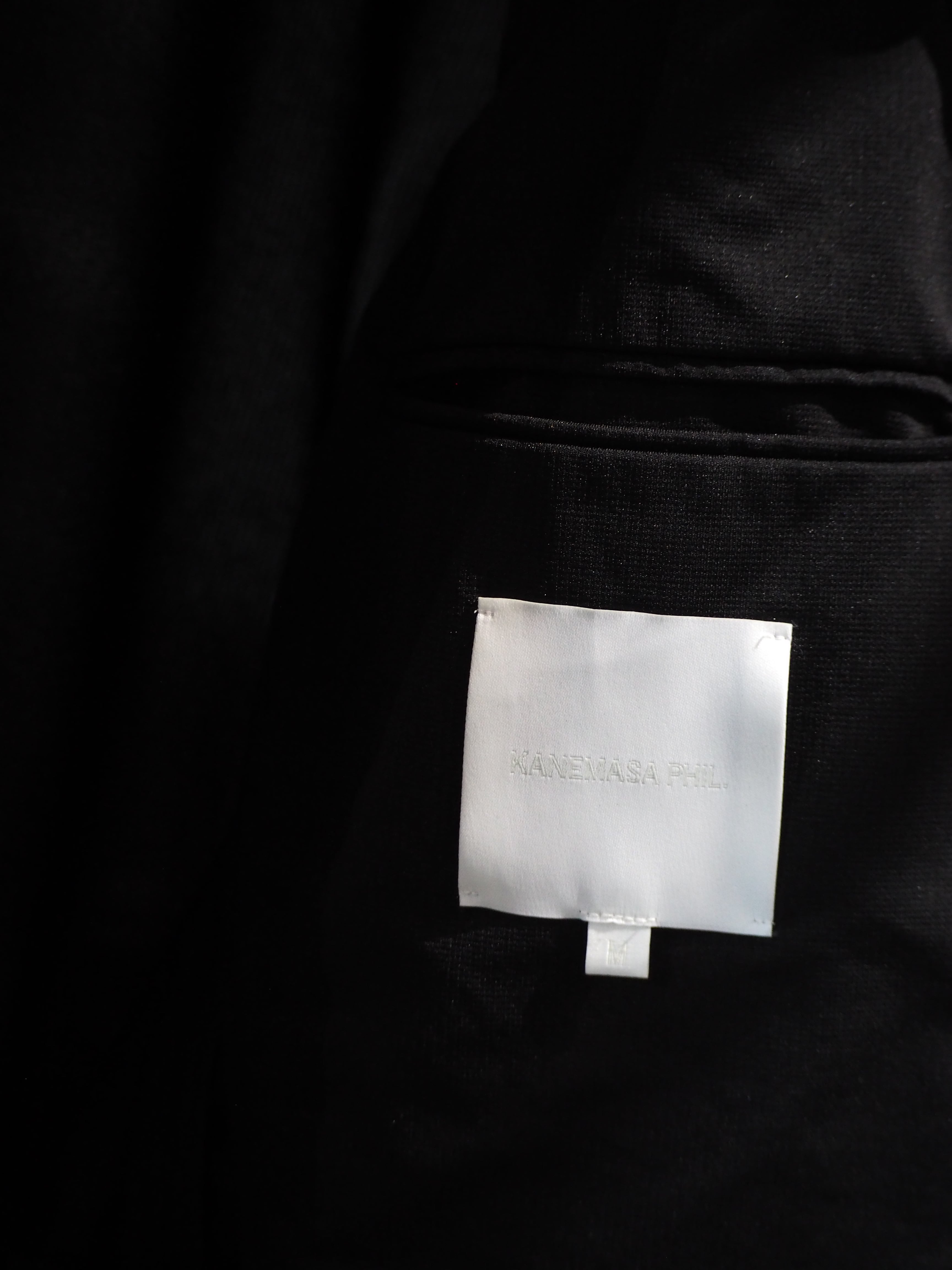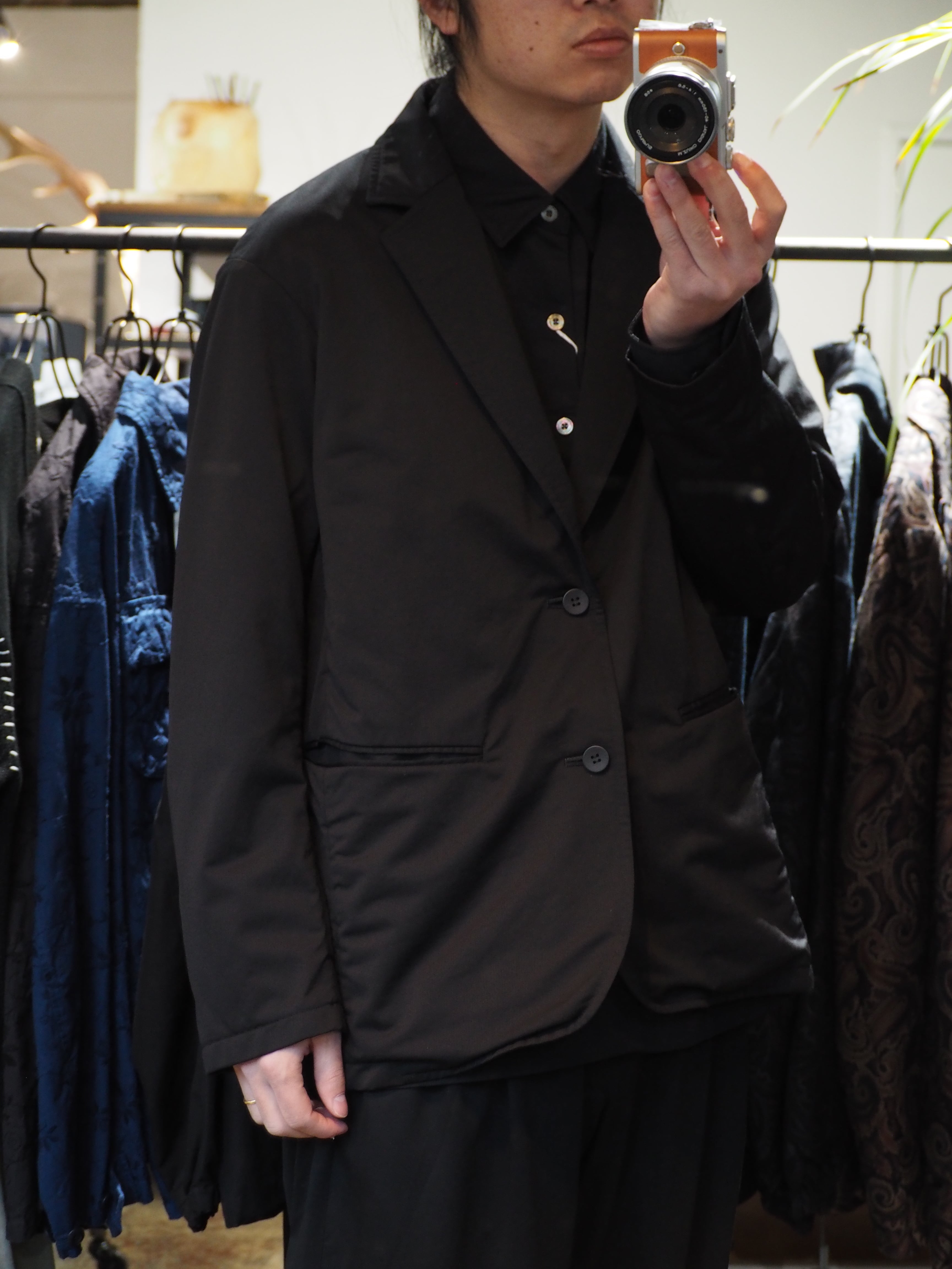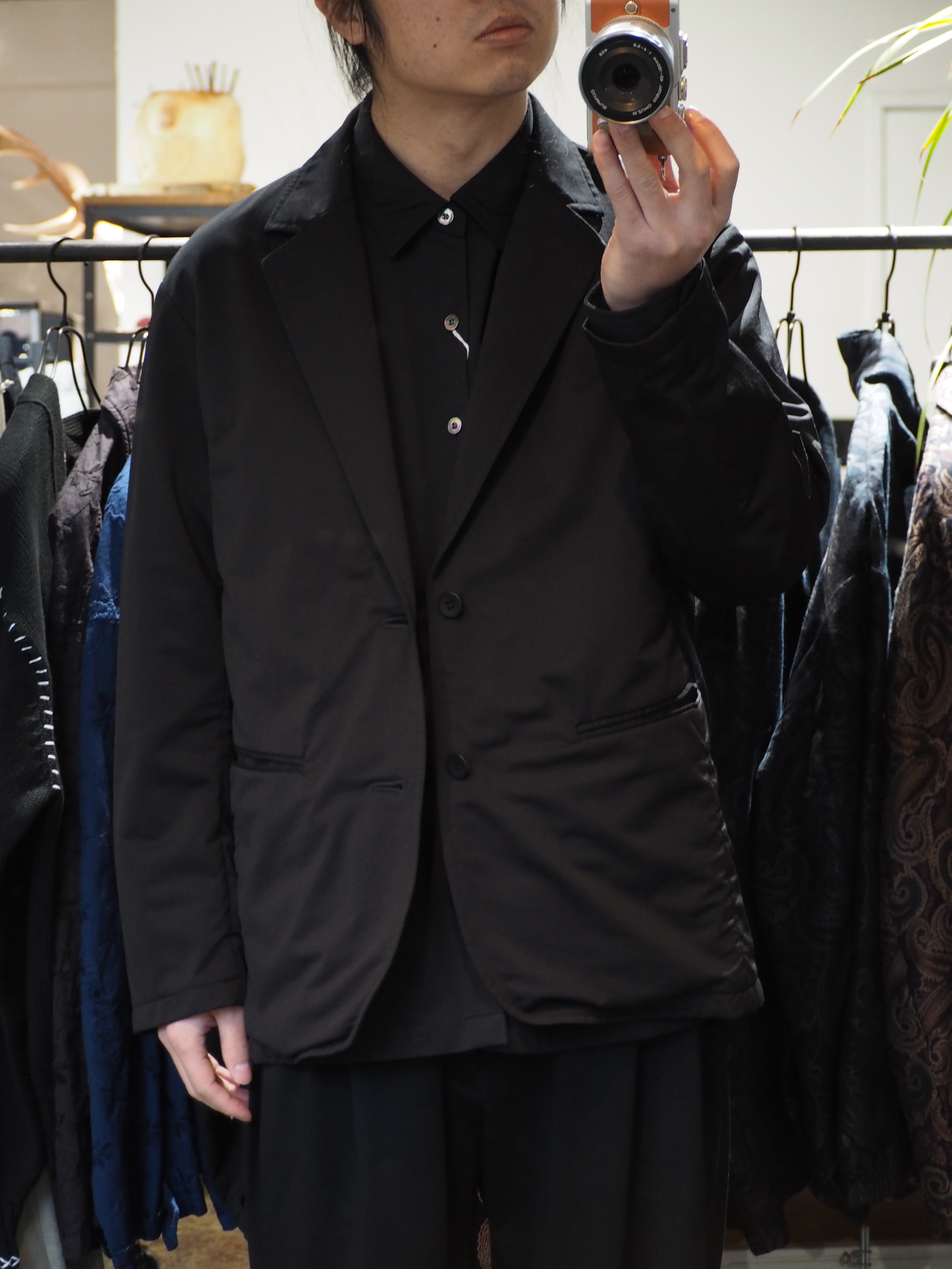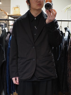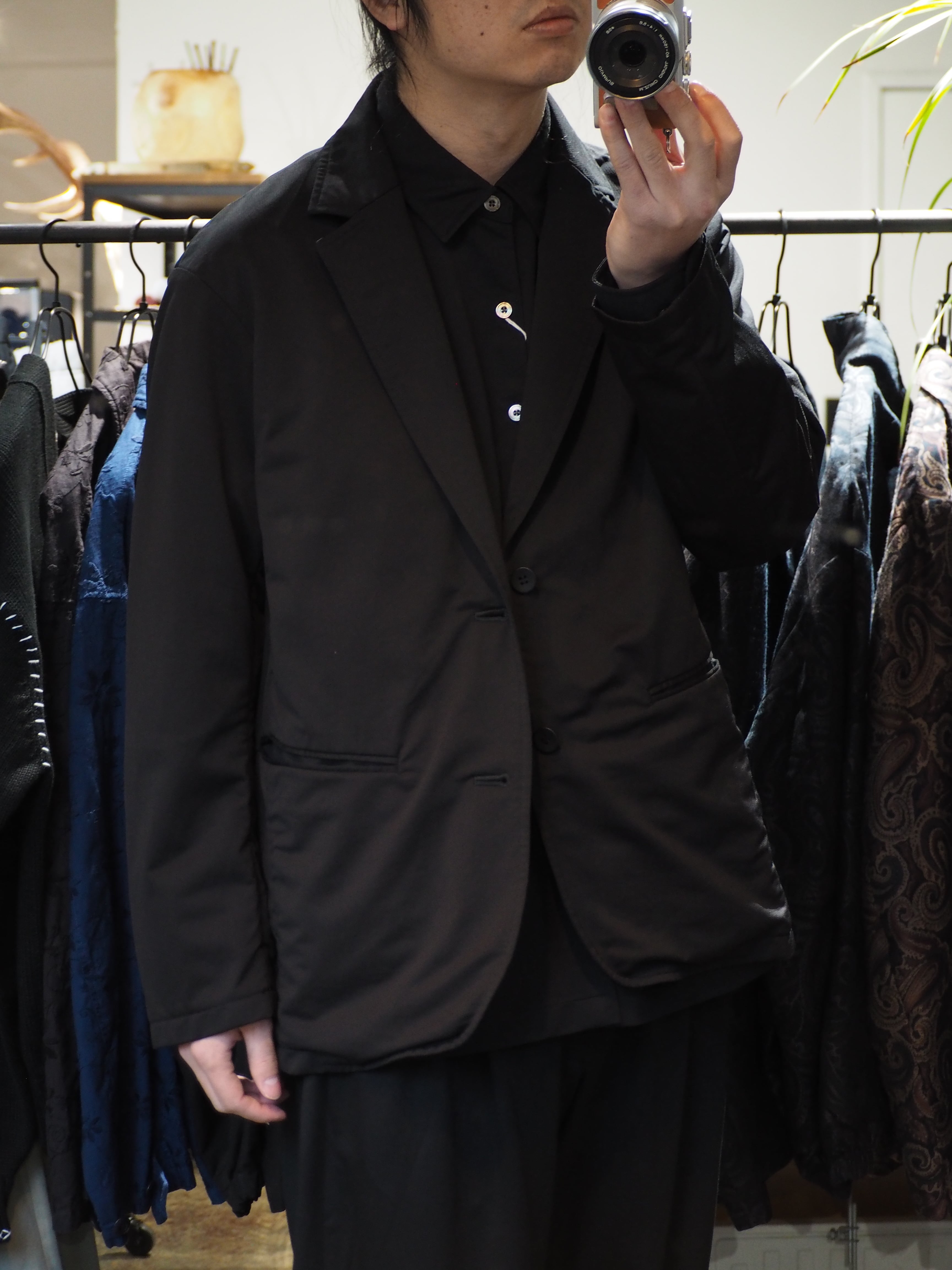 ディティールは、ドレスシャツを採用し全て巻き伏せ本縫い仕様、貝蝶釦使いです。素材のハリ感、光沢感、そして塩梅の良いシルエット、生地が生み出すドレッシー感が特徴です。