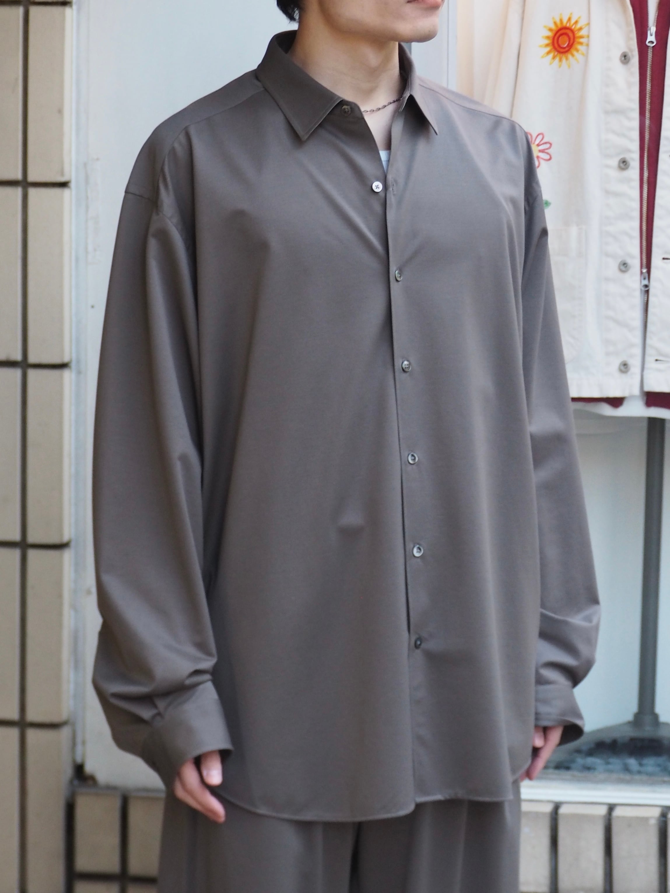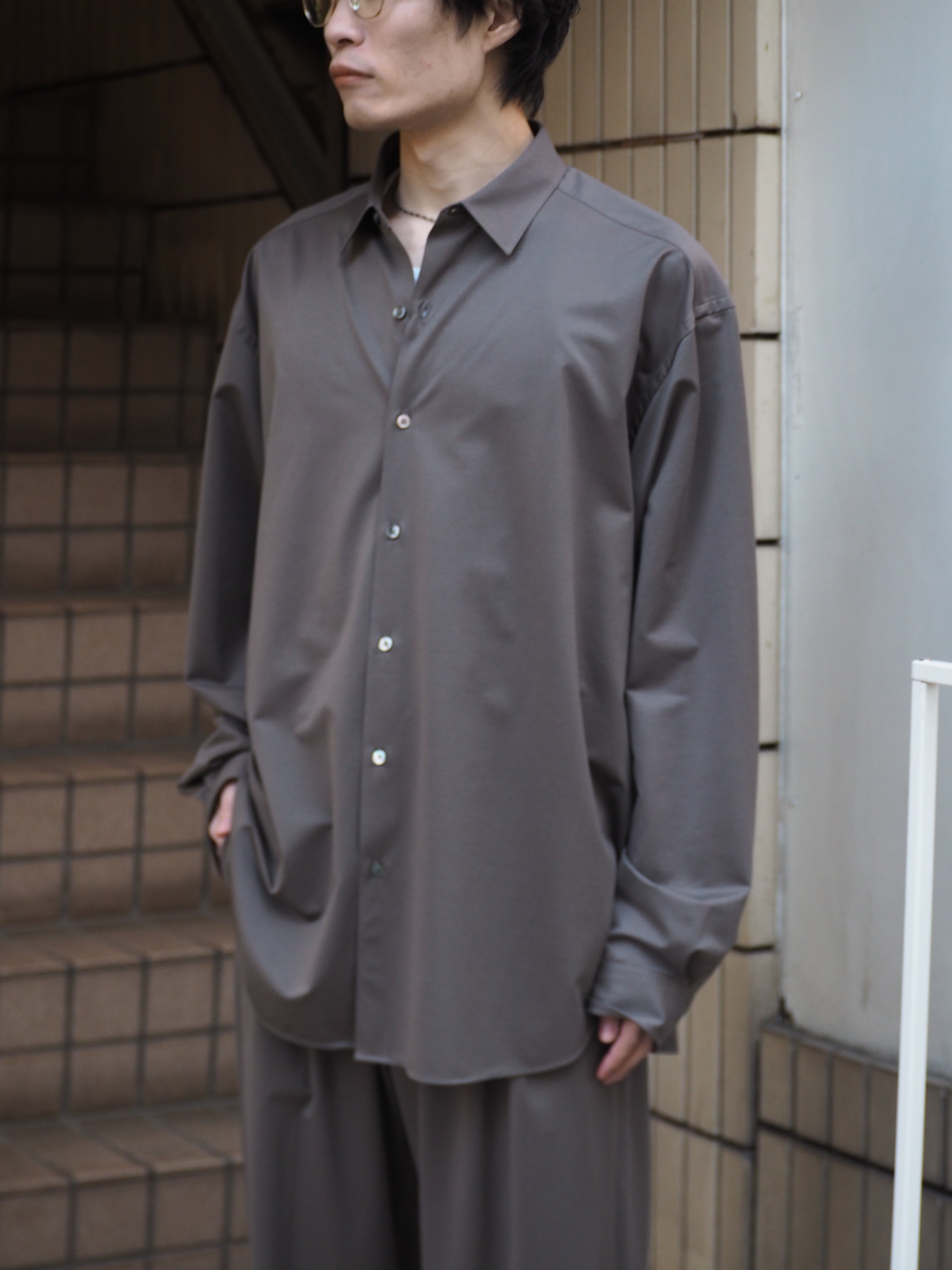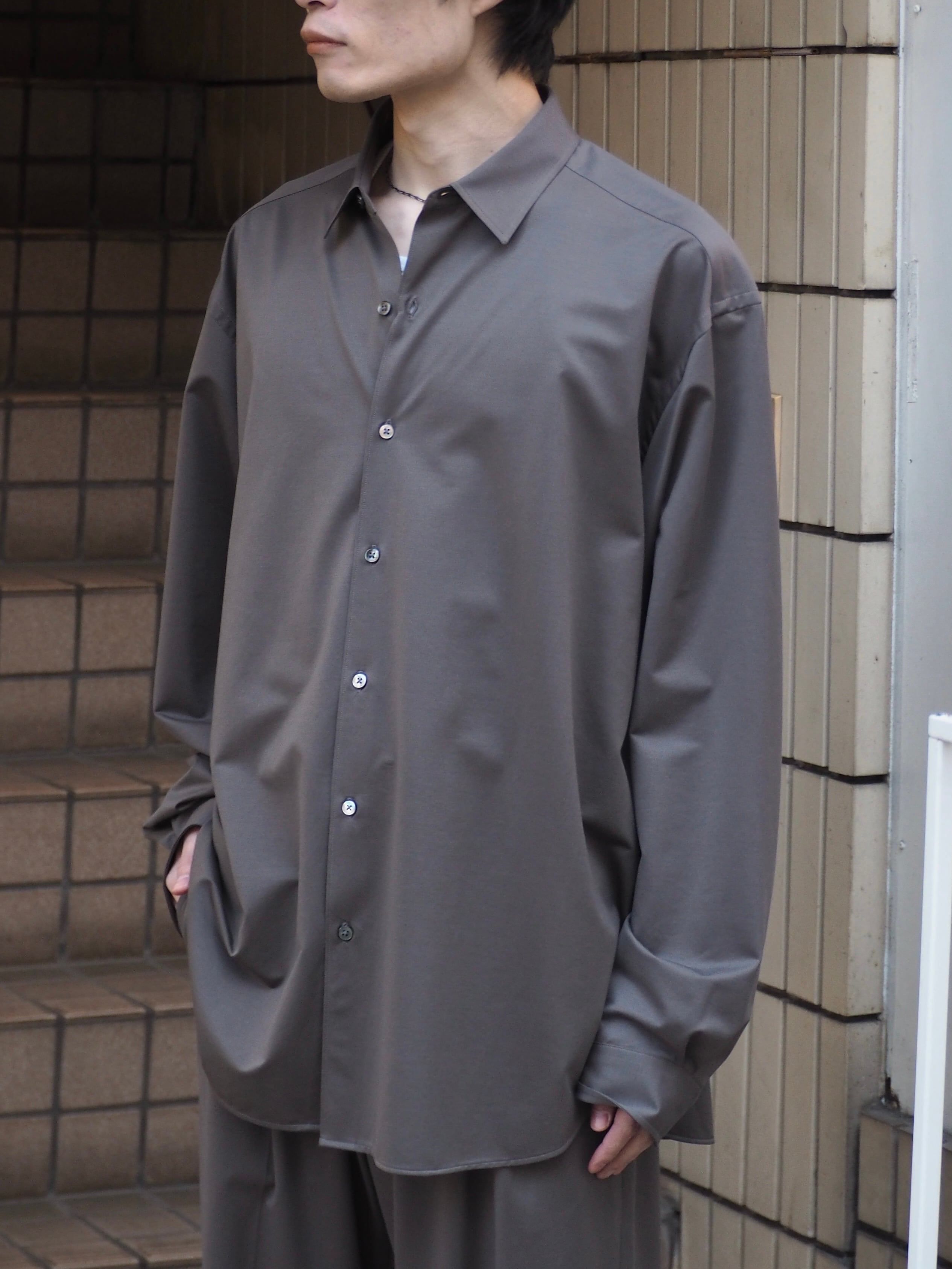 “atmosphere” 空気を纏うという名前の通り、 ゆったりとしたシルエット、素材の落ち感がわかりやすい定番シルエットのシャツです。