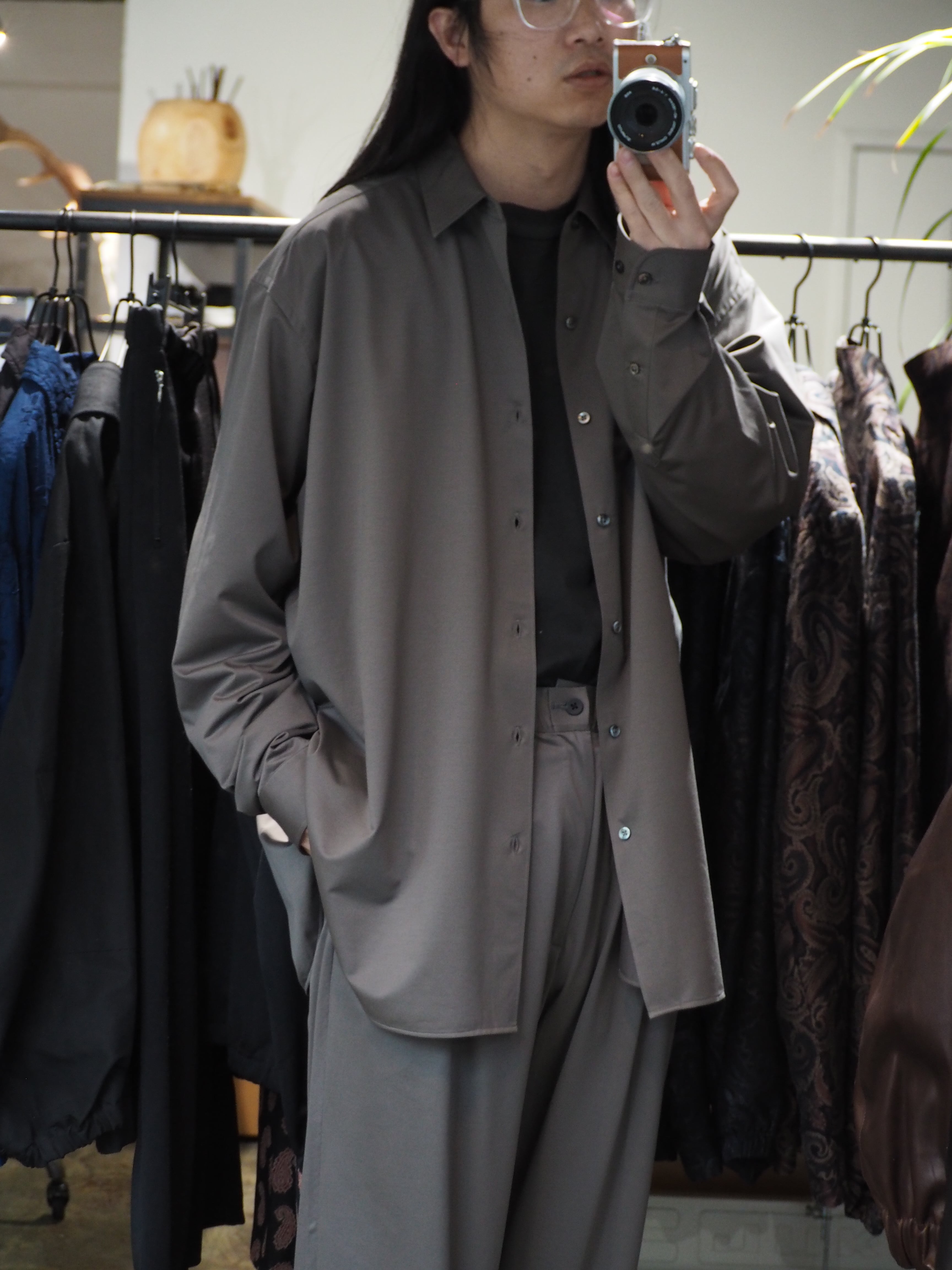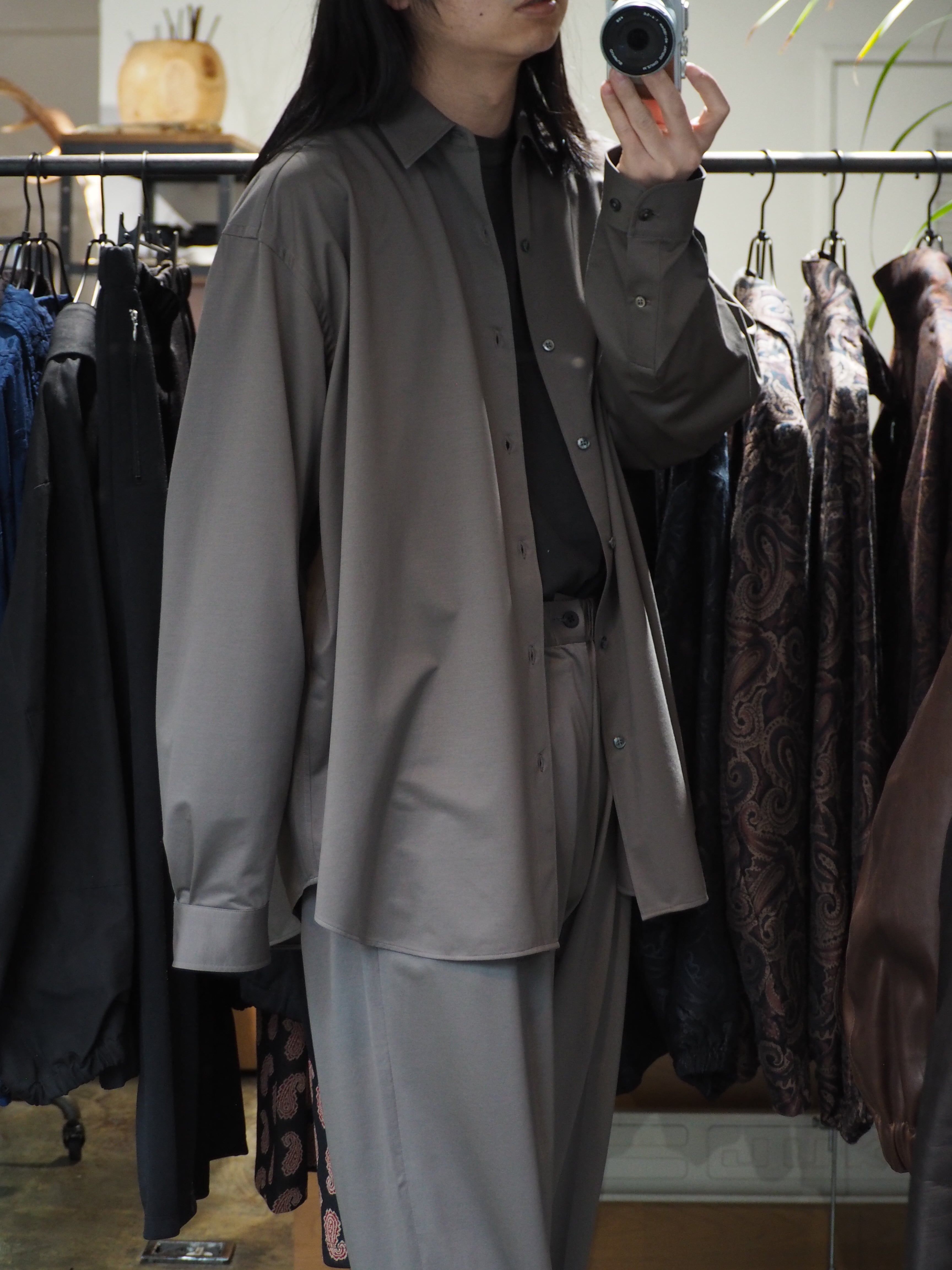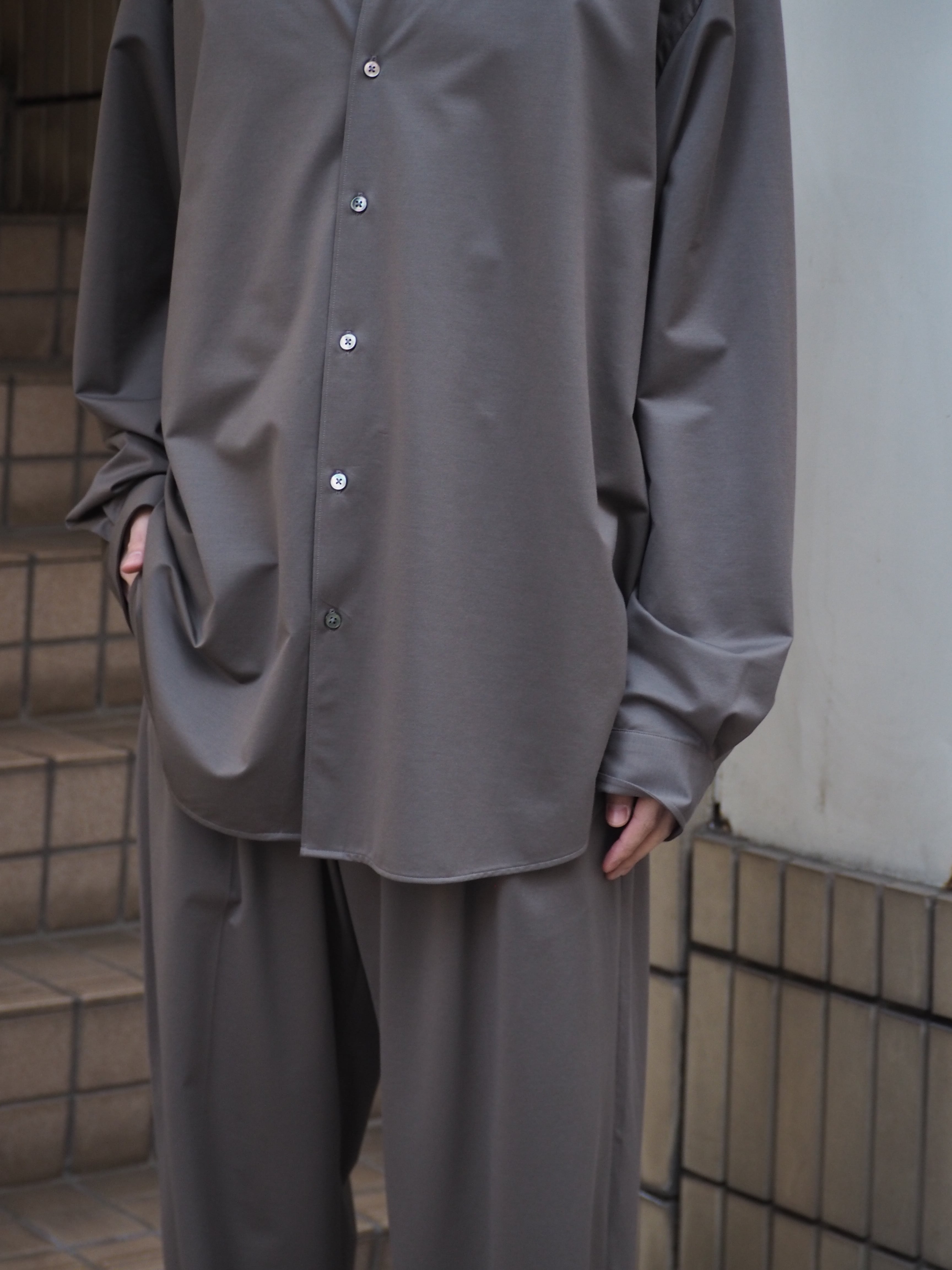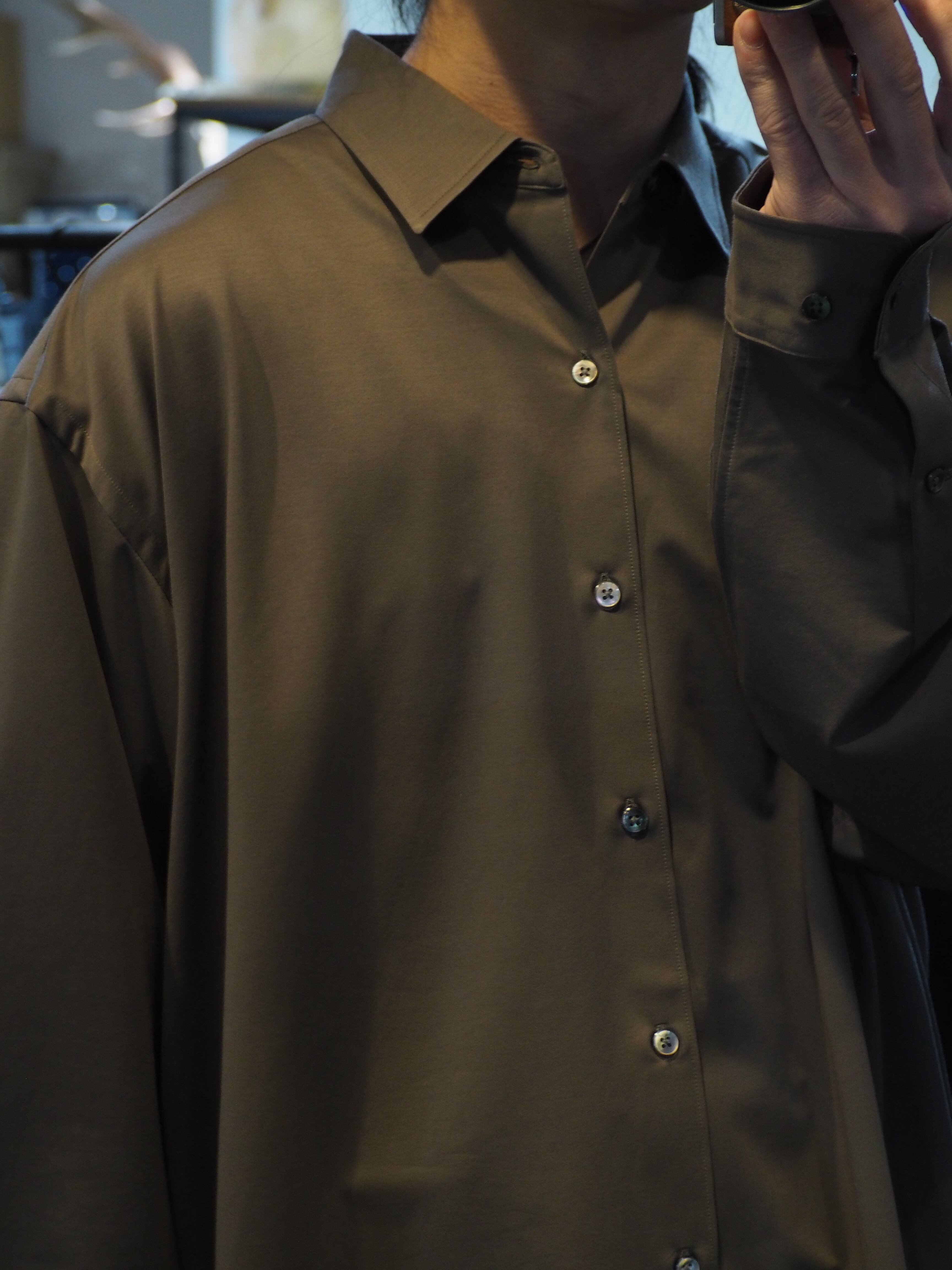 “atmosphere” 空気を纏うという名前の通り、 ゆったりとしたシルエット、素材の落ち感がわかりやすい定番シルエットのシャツです。