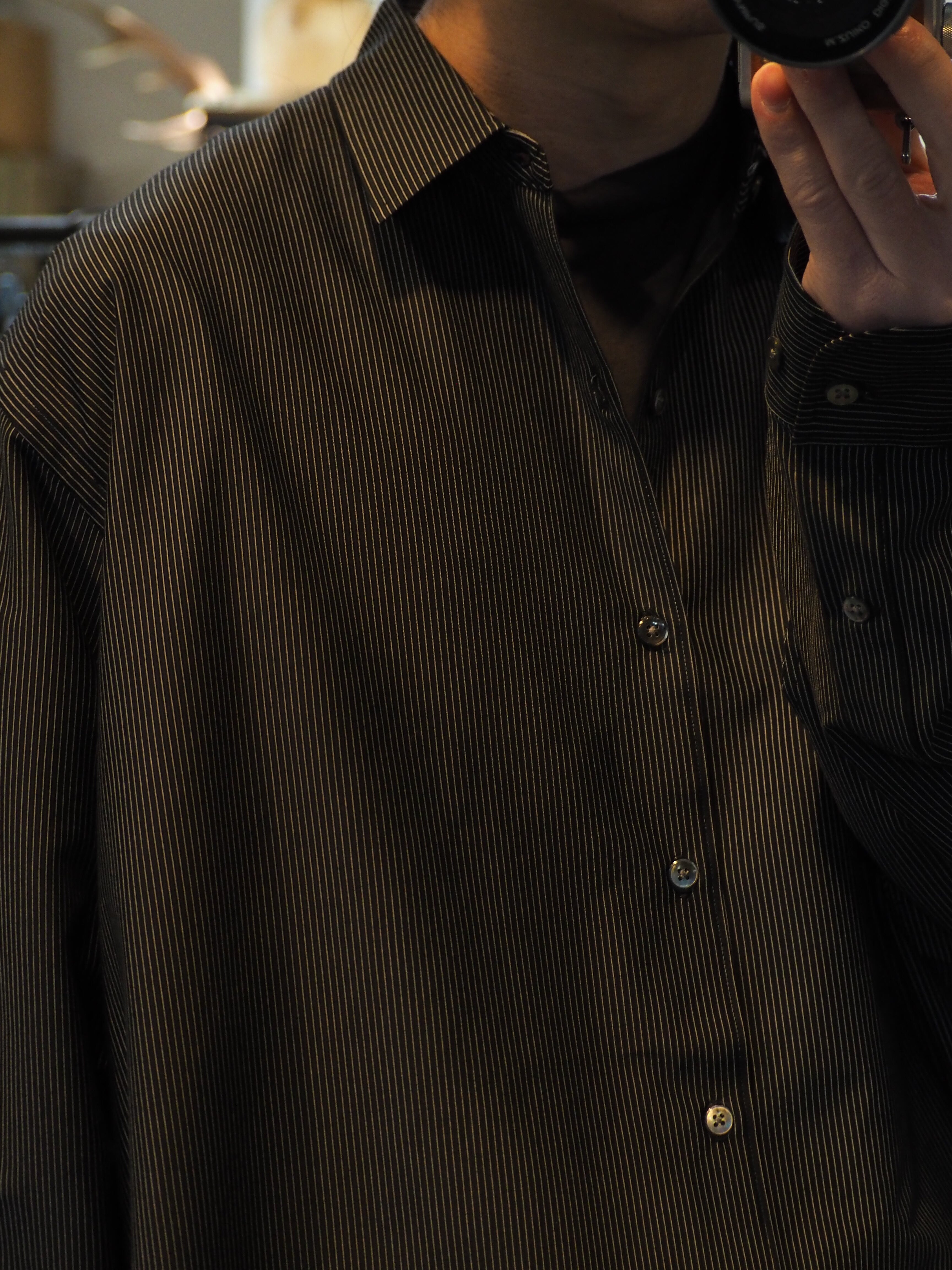 ディティールは、ドレスシャツを採用し全て巻き伏せ本縫い仕様、貝蝶釦使いです。素材のハリ感、光沢感がある為、オーバーパターンですがカジュアルになりすぎない、生地が生み出すドレッシー感とパターンが生み出すカジュアル感を融合させた、ラグジュアリールーズな唯一無二のシャツ。