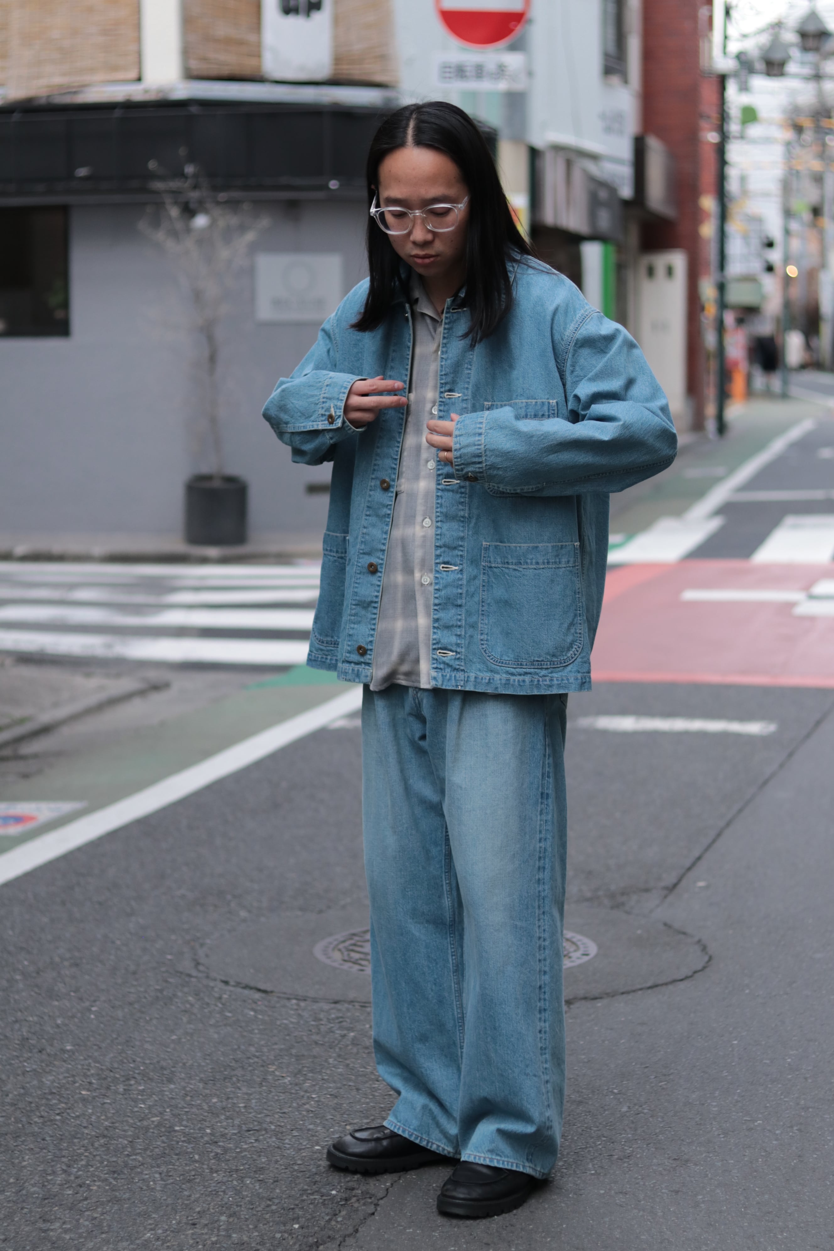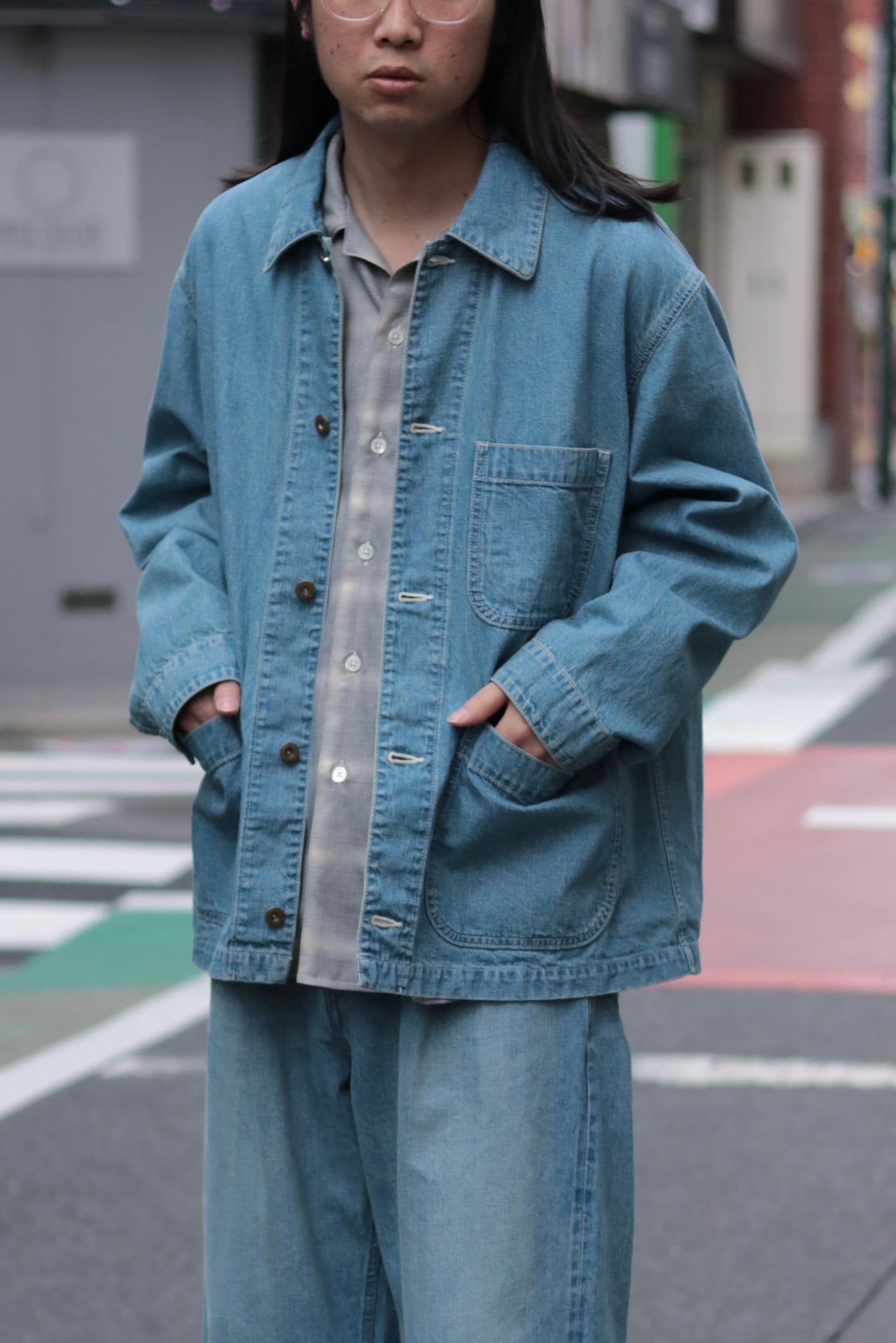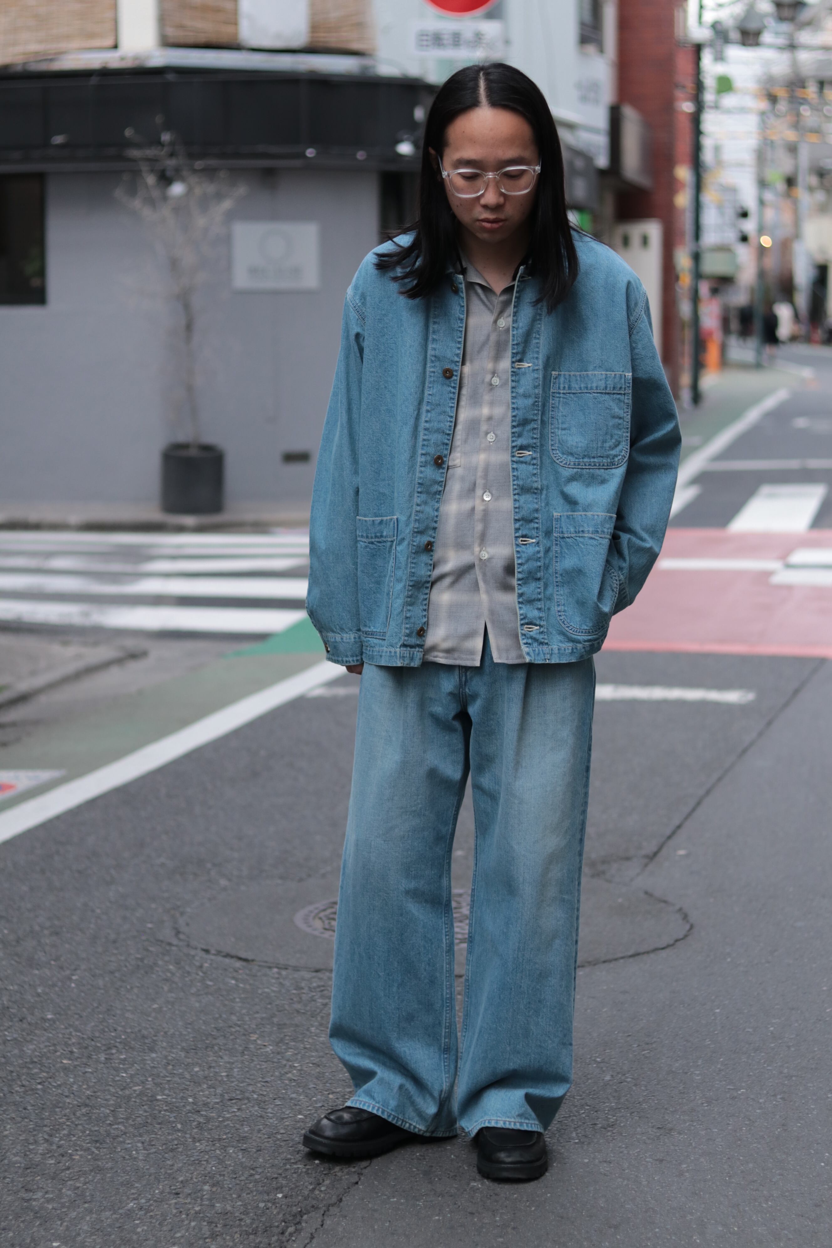 ゆったりとしたビックシルエットで2本針巻縫いで堅牢に仕立て、フロントはタックボタンを採用。