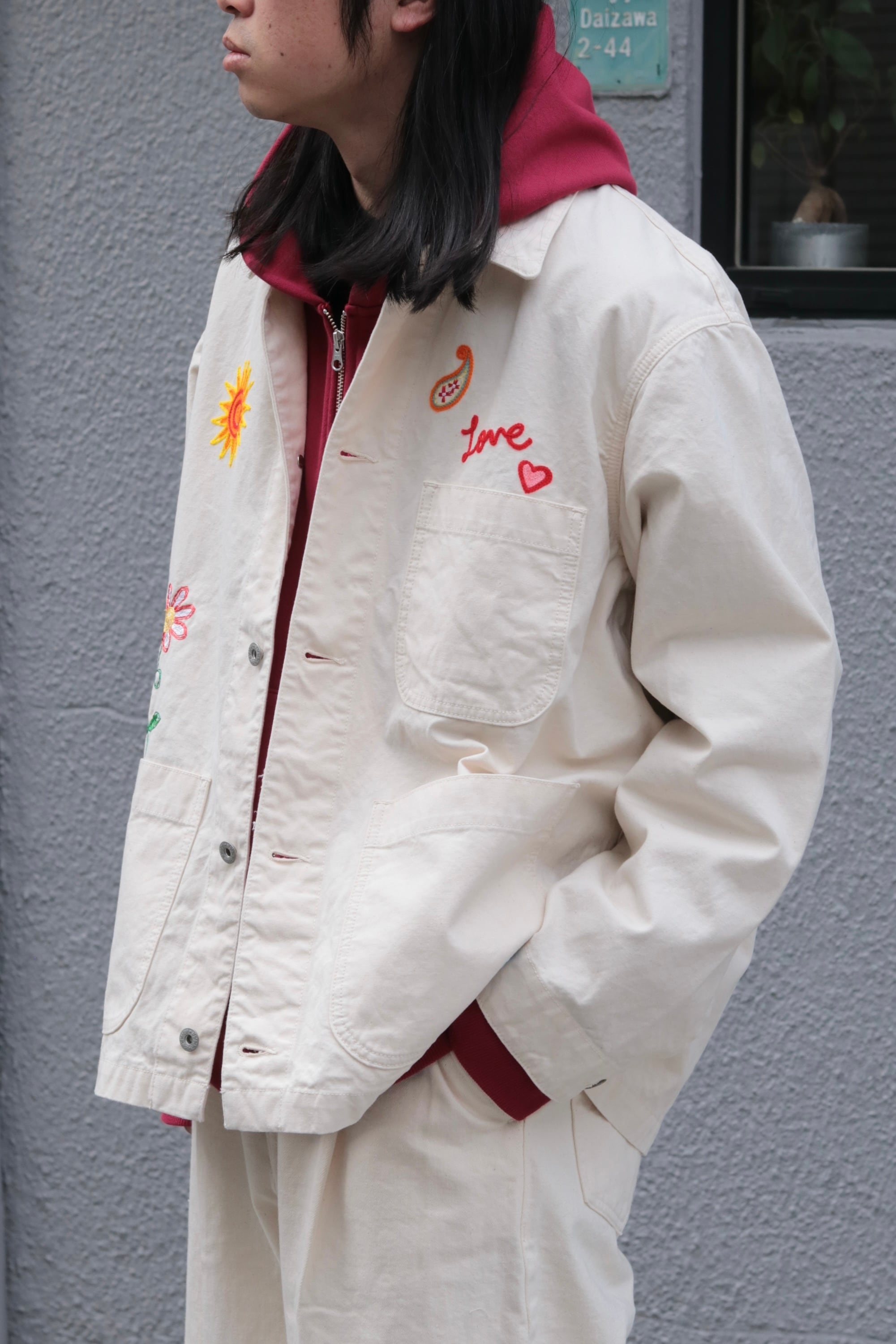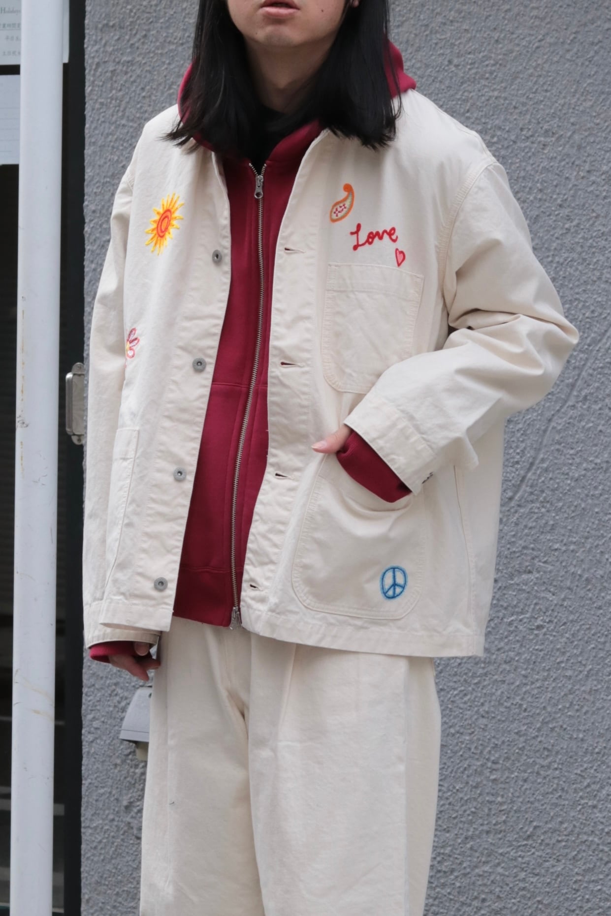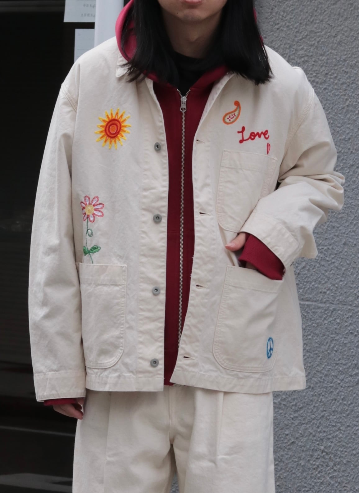 ゆったりとしたビックシルエットで2本針巻縫いで堅牢に仕立て、フロントはタックボタンを採用。洗いをかけ、生地の風合いを生かしています。