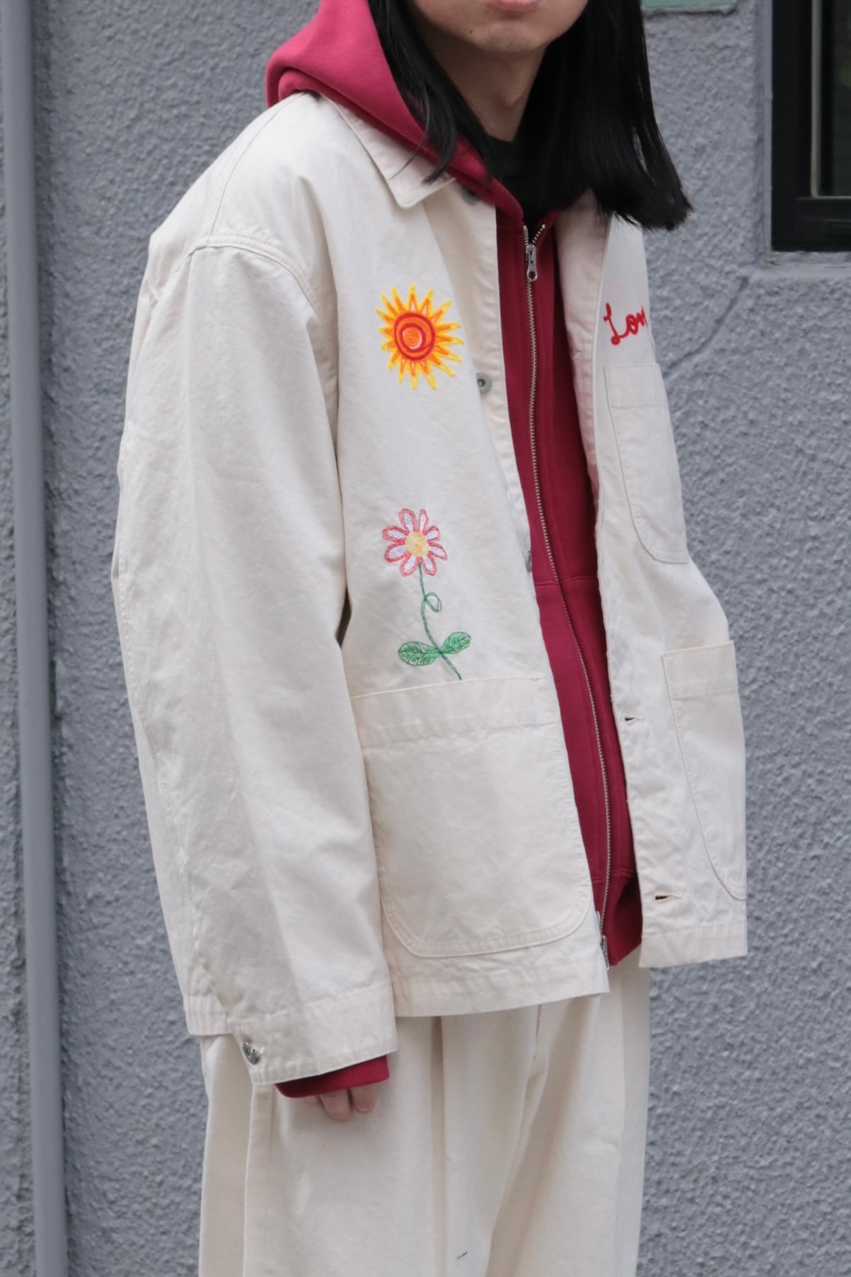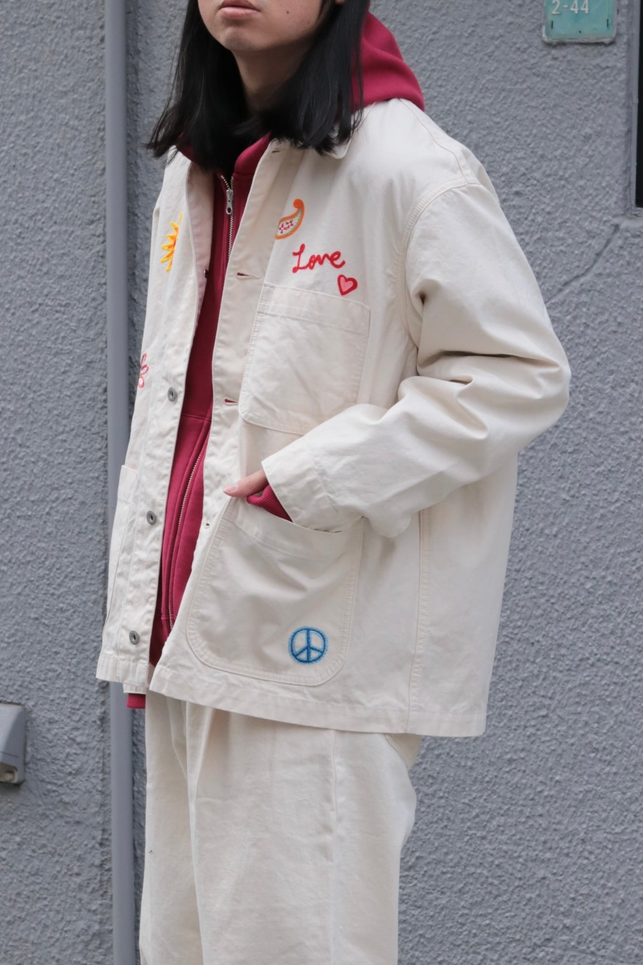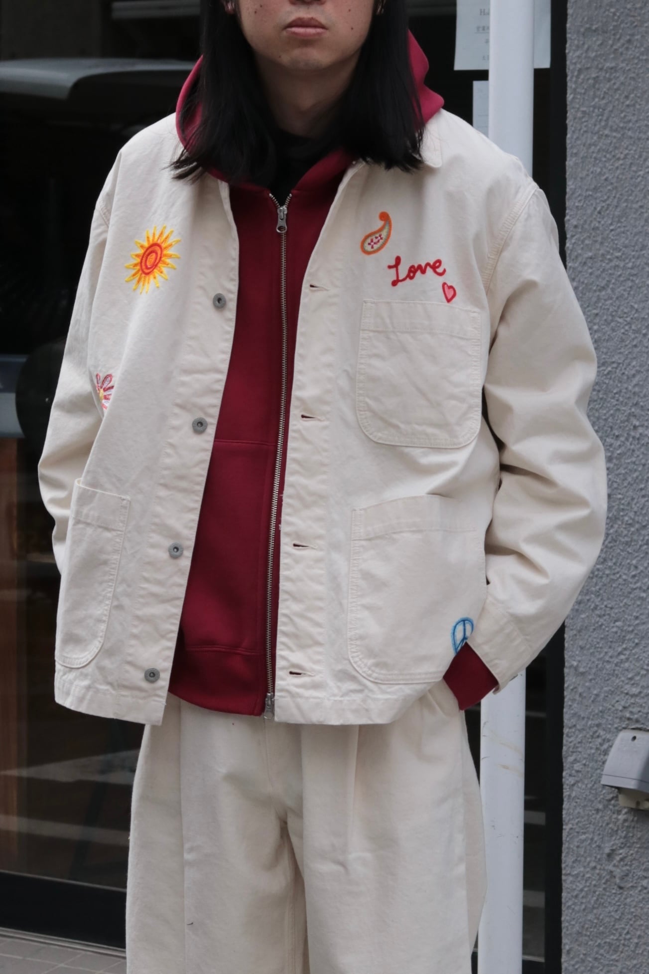 ゆったりとしたビックシルエットで2本針巻縫いで堅牢に仕立て、フロントはタックボタンを採用。洗いをかけ、生地の風合いを生かしています。