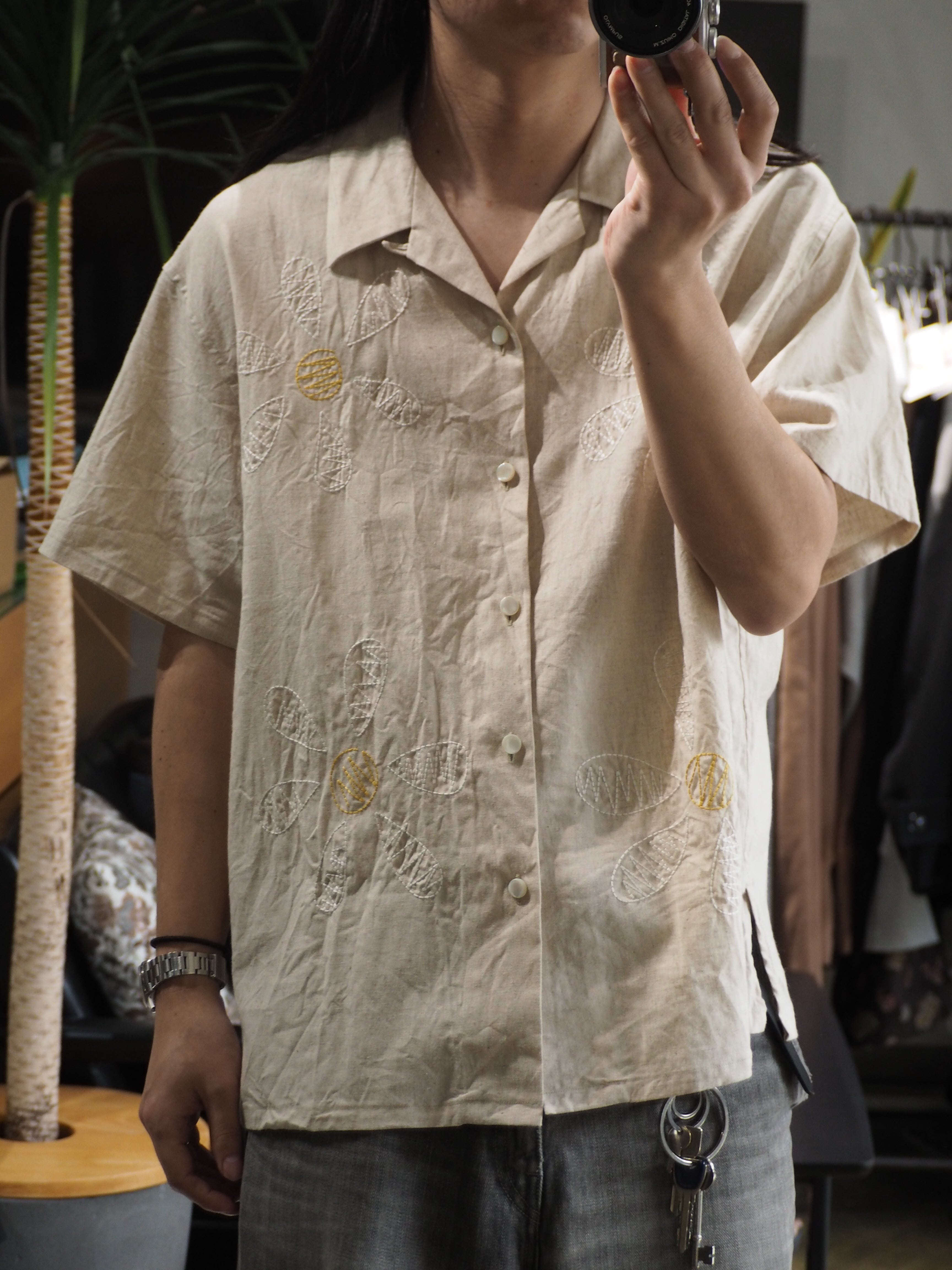 綿麻の薄手のポプリン素材に大胆な手書き風の花柄を刺繍したオープンカラーシャツです。