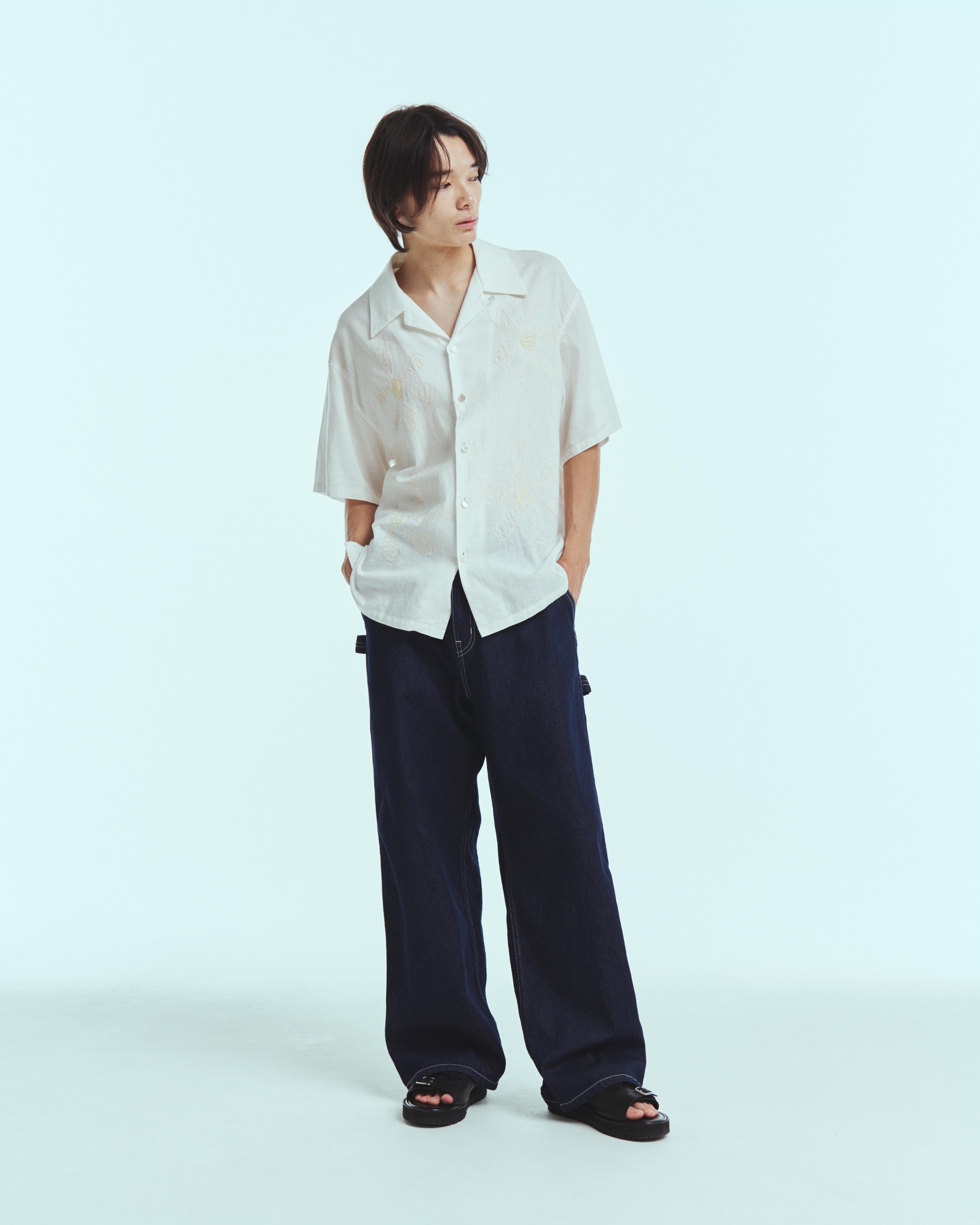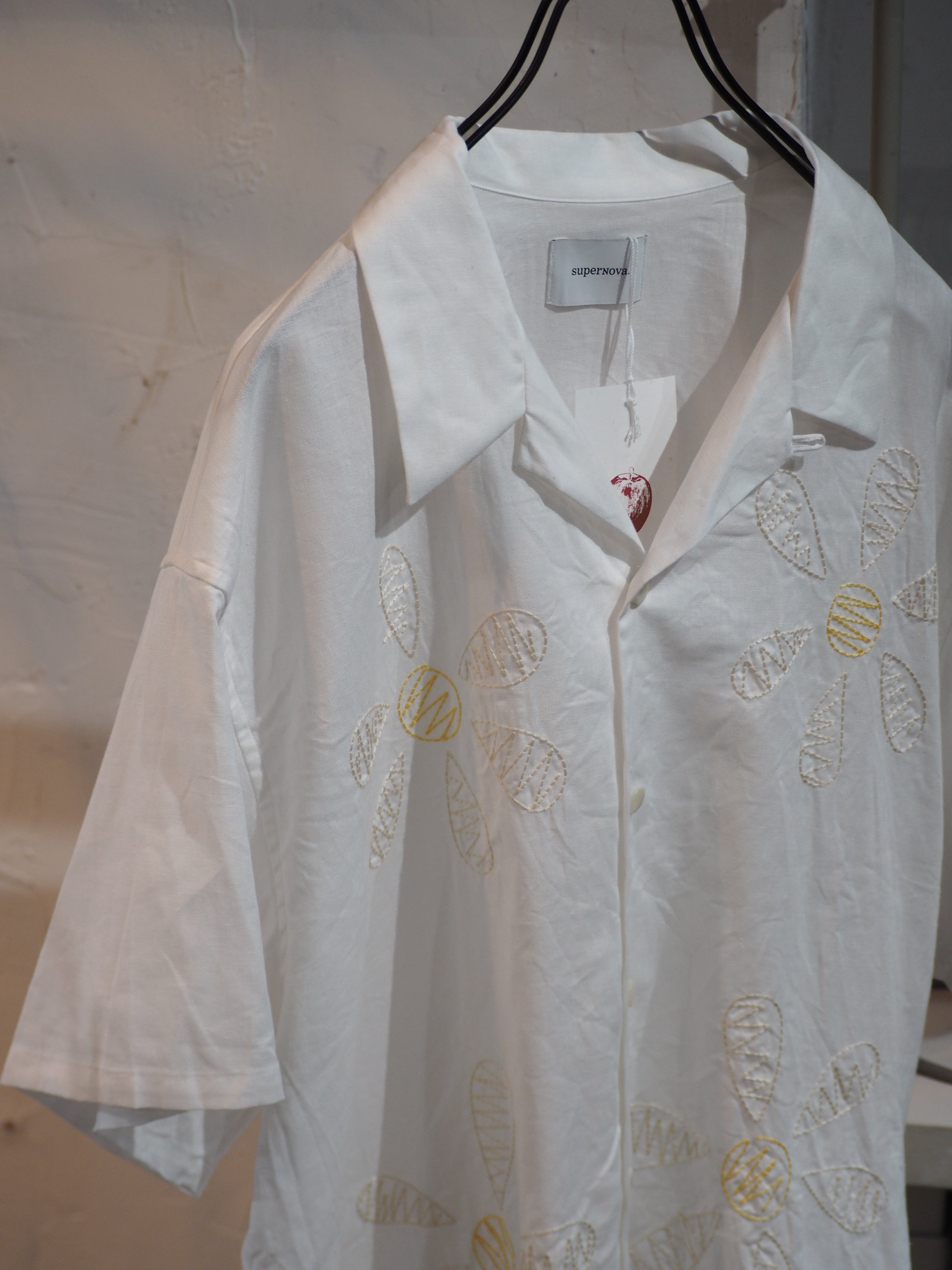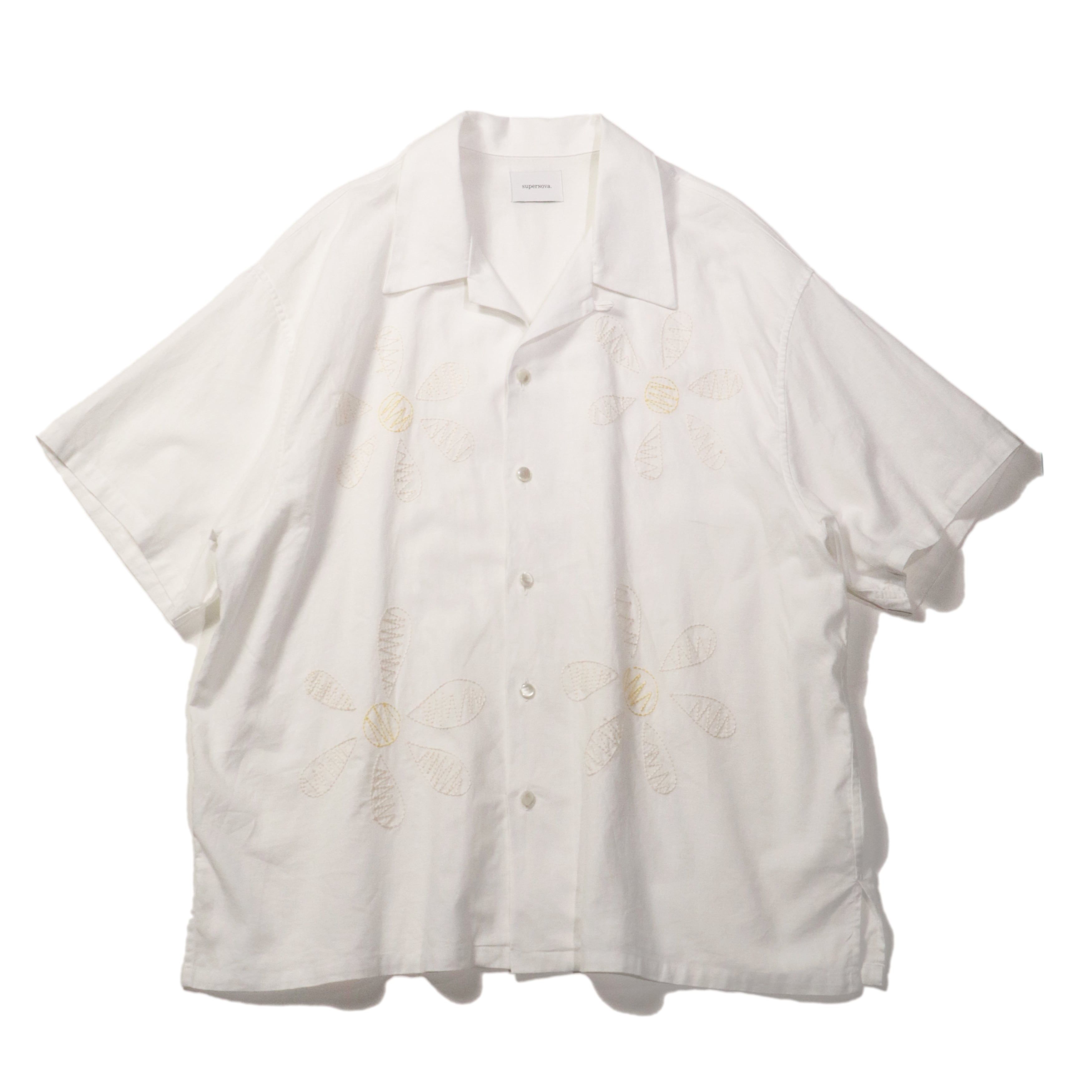綿麻の薄手のポプリン素材に大胆な手書き風の花柄を刺繍したオープンカラーシャツです。