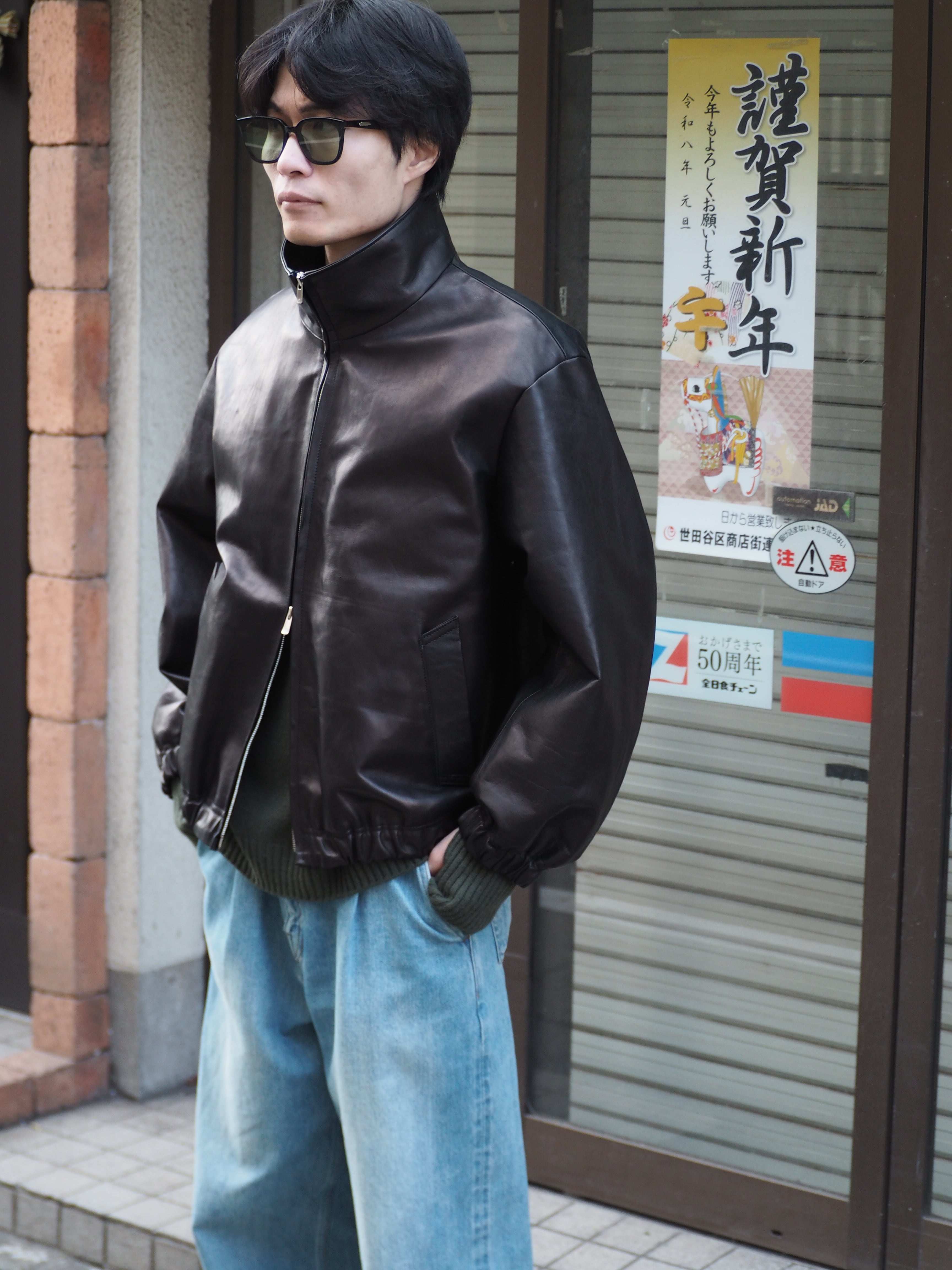 superNova.のトラックジャケットの特徴である、ゆったりとしたシルエットと、革本来の風合い、表情を生かすことを重視し、パーツを大きく裁断でき、軽く、柔らかい、「素上げ馬革」を使用。